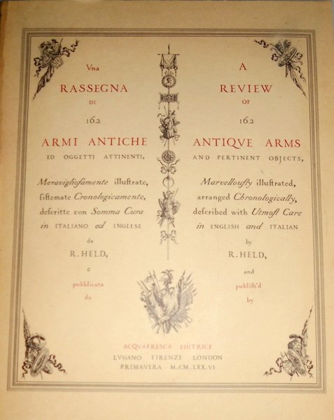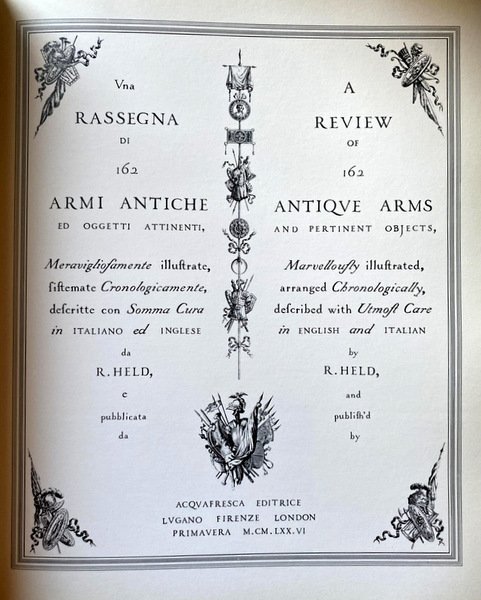 UNA RASSEGNA DI 162 CENTOSESSANTADUE ARMI ANTICHE ED OGGETTI ATTINENTI MERAVIGLIOSAMENTE ILLUSTRATE, SISTEMATE CRONOLOGICAMENTE, DESCRITTE CON SOMMA CURA IN ITALIANO ED INGLESE DA R. HELD; A REVIEW OF 162 ANTIQUE ARMS AND PERTINENT OBJECTS MARVELLOUSLY ILLUSTRATED, ARRANGED CHRONOLOGICALLY, DESCRIBED WITH UTMOST CARE IN ENGLISH AND ITALIAN