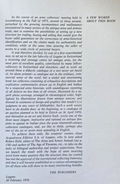 Nel corso di un convegno di collezionisti di tenutosi tosi a Lussemburgo nell'autunno del 1975, alcuni dei partecipanti, sconcertati dalla crescente incompetenza e malafede prevalente in molti settori del commercio di armi antiche, si incontrarono per esaminare la possibilità di erigere una nuova struttura di scambi, acquisti e vendite che avrebbe assicurato all'acquirente garanzie serie sulla giustezza delle classificazioni storiche-tecniche e sulle rappresentazioni di autenticità e di stato di conservazione, mentre allo stesso tempo, avrebbe assicurato al venditore accesso ad un'ampia cerchia di eventuali compratori. Fu quindi deciso, in via di un primo passo sperimentale, far stabilire nella bella città lacustre di Lugano un centro di raccolta di armi antiche, per lo più di eccellente qualità, provenienti da molti colleghi-collezionisti in Svizzera ed all'estero, e di far comporre su di esse un catalogo didascalico di una sorta fino ad allora inaudita e tanto meno stampato - un catalogo non nel senso ordinario, commerciale della parola, bensì un libro utile e divertente per collezionisti, consistente in schede esaurienti con commentari esplicativi preparate in italiano ed inglese da un rispettato studio: materia, con messa in rilievo senza ambiguità di tutti i difetti, non solo dei pregi, illustrate con superlativa foto documentazione, arrangiate in ordine cronologico, lumeggiate da materiale iconografico tratto da sorgenti antiche, e collocate in una veste grafica che non doveva temere giudizio in qualunque tribunale di bibliofili. Tale opera doveva prestare duplice servizio: all'inizio, da catalogo di un'asta destinata a svolgersi a Zurigo il 26 aprile 1976, ed in seguito da un libro d'arte e di storia, senz'altro uno dei tre più eleganti, informativi e razionali su armi da fuoco antiche comparsi in lingua italiana dai grandi cataloghi dell'800, nonché, ci compiace credere, uno dei sei o sette più allettanti in inglese.