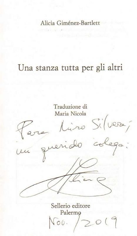 In-8°, legatura editoriale in brossura con alette, pp. 295(5). Al frontespizio dedica autografa firmata della scrittrice a Miro Silvera, 'querido colega'. Prima edizione italiana - nella traduzione di Maria Nicola. Piccoli difetti alla brossura, ma buon esemplare. Alicia Giménez Bartlett (Almansa, 10 giugno 1951) è una scrittrice spagnola, conosciuta principalmente per i suoi romanzi polizieschi che hanno per protagonista l'ispettrice di polizia Petra Delicado. Le opere di Bartlett, tradotte in quindici lingue, hanno avuto un notevole successo in Francia, Germania, Stati Uniti d'America e Italia. Ha vinto il Premio Nadal nel 2011 e il Premio Planeta nel 2015.