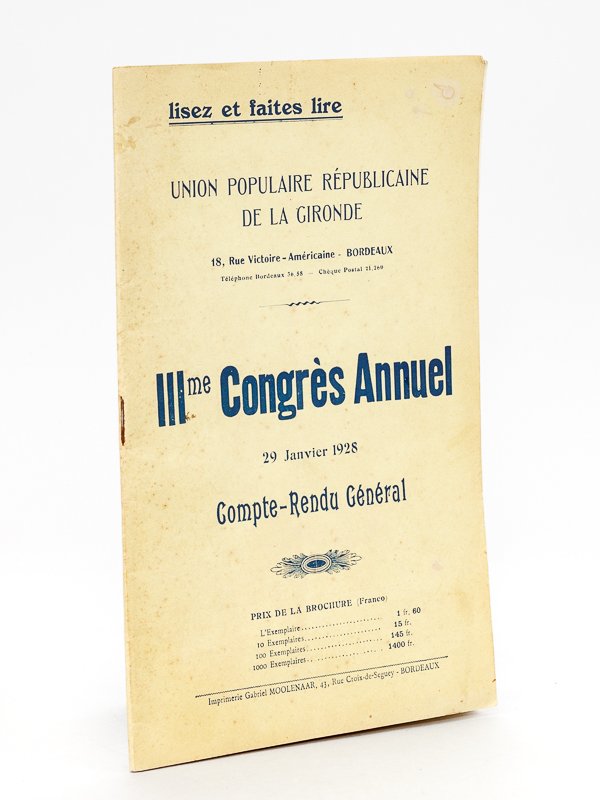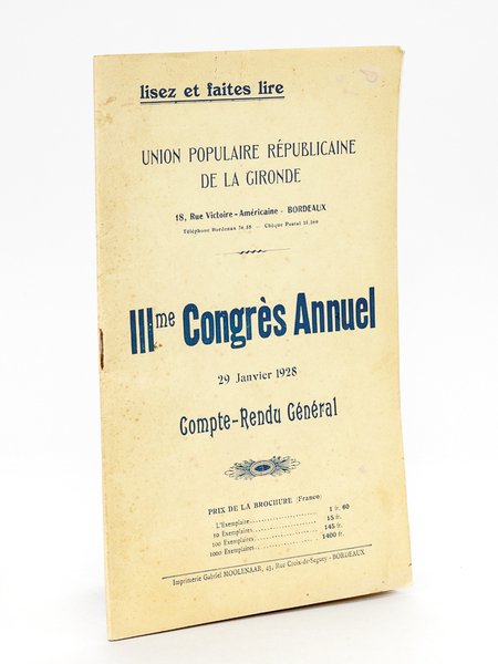 Union Populaire Républicaine de la Gironde. IIIme Congrès Annuel 29 Janvier 1928. Compte-Rendu Général.