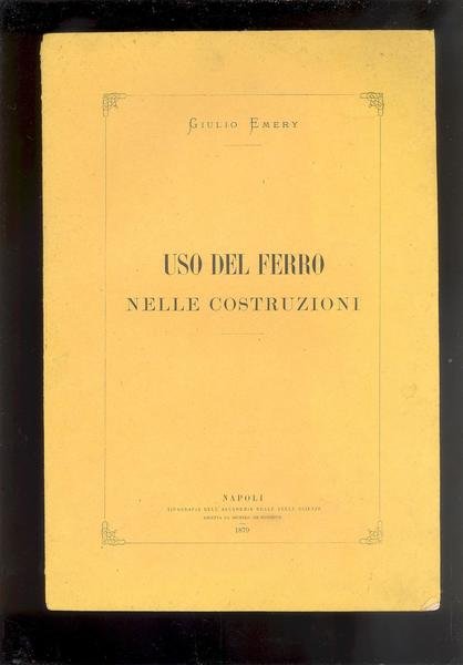 IN 8°, pp.24, COPERTINA EDITORIALE CON TITOLO ENTRO CORNICE.<BR>CONFERENZA SULL'USO DEL FERRO NELLE COSTRUZIONI E SUA INFLUENZA SUL CARATTERE DELLE MEDESIME PER L' INGEGNERE GIULIO EMERY, LETTA AL COLLEGIO<BR>DEGL' INGEGNERI ED ARCHITETTI IN NAPOLI NELL'ADUNANZA DEL 3 APRILE 1879.<BR>OTTIMA CONSERVAZIONE, SALVO PICCOLA MACCHIA IN ALTO ALLA SECONDA DI COPERTINA.<BR> ID 1847