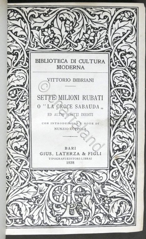 V. Imbriani - Sette milioni rubati o La Croce Sabauda - ed. 1938 Laterza