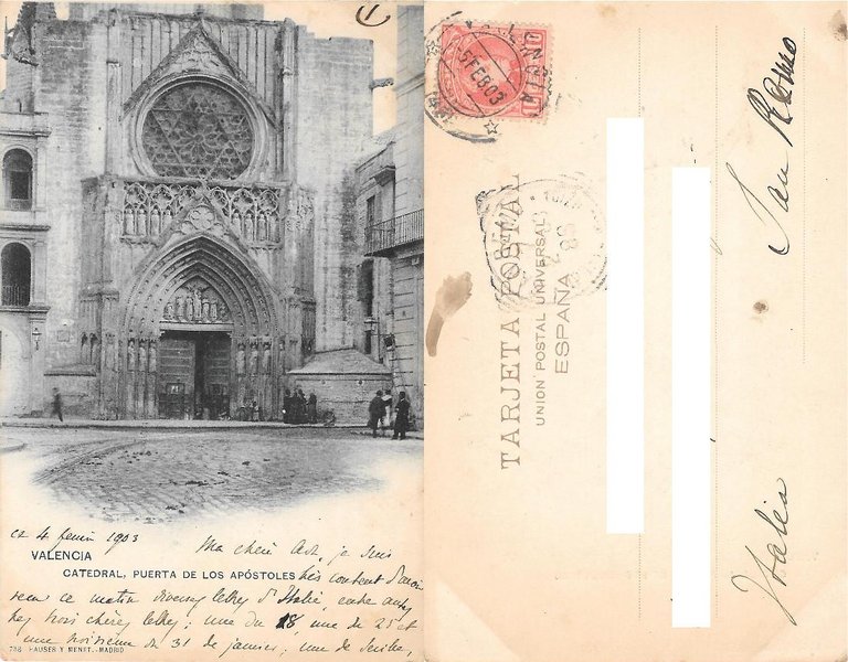 Valencia (SPA). Catedral, puerta de los Apostoles. Ed. Hauser y Menet. Viaggiata 1903