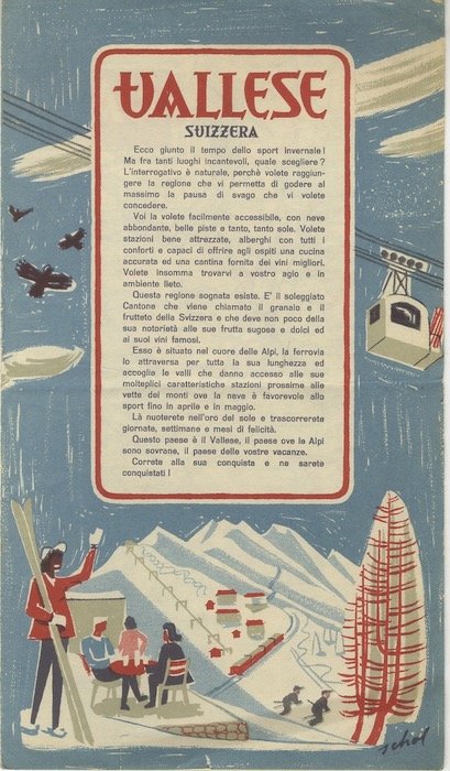 Depliant a fisarmonica di 39x22 cm aperto e 12x22 cm chiuso. Condizioni : USATO - Stato : Buono, ordinari segni d'uso e del tempo. Altre note : Al recto due bozzetti a colori di Schol a colori, al verso mappa della zona.