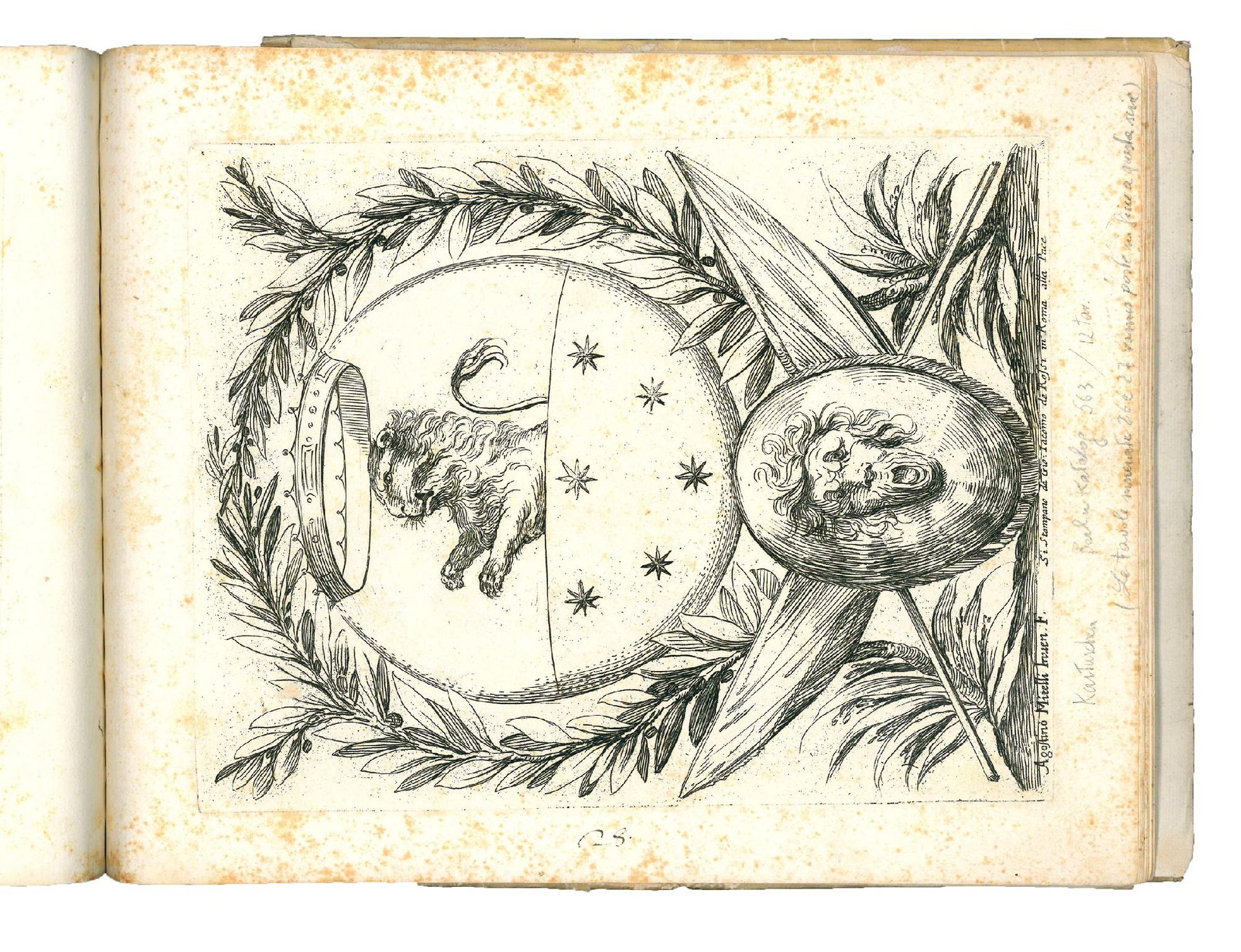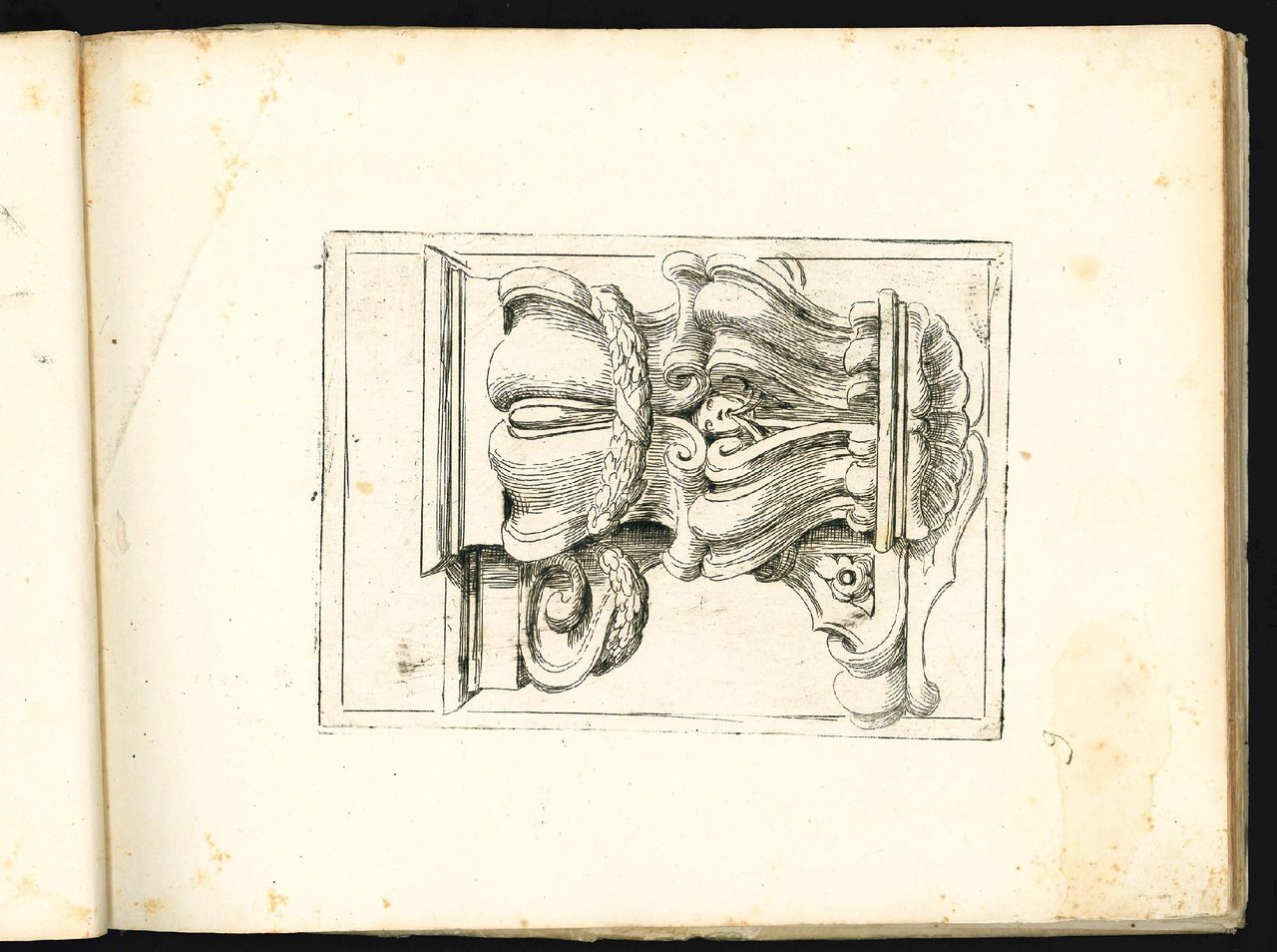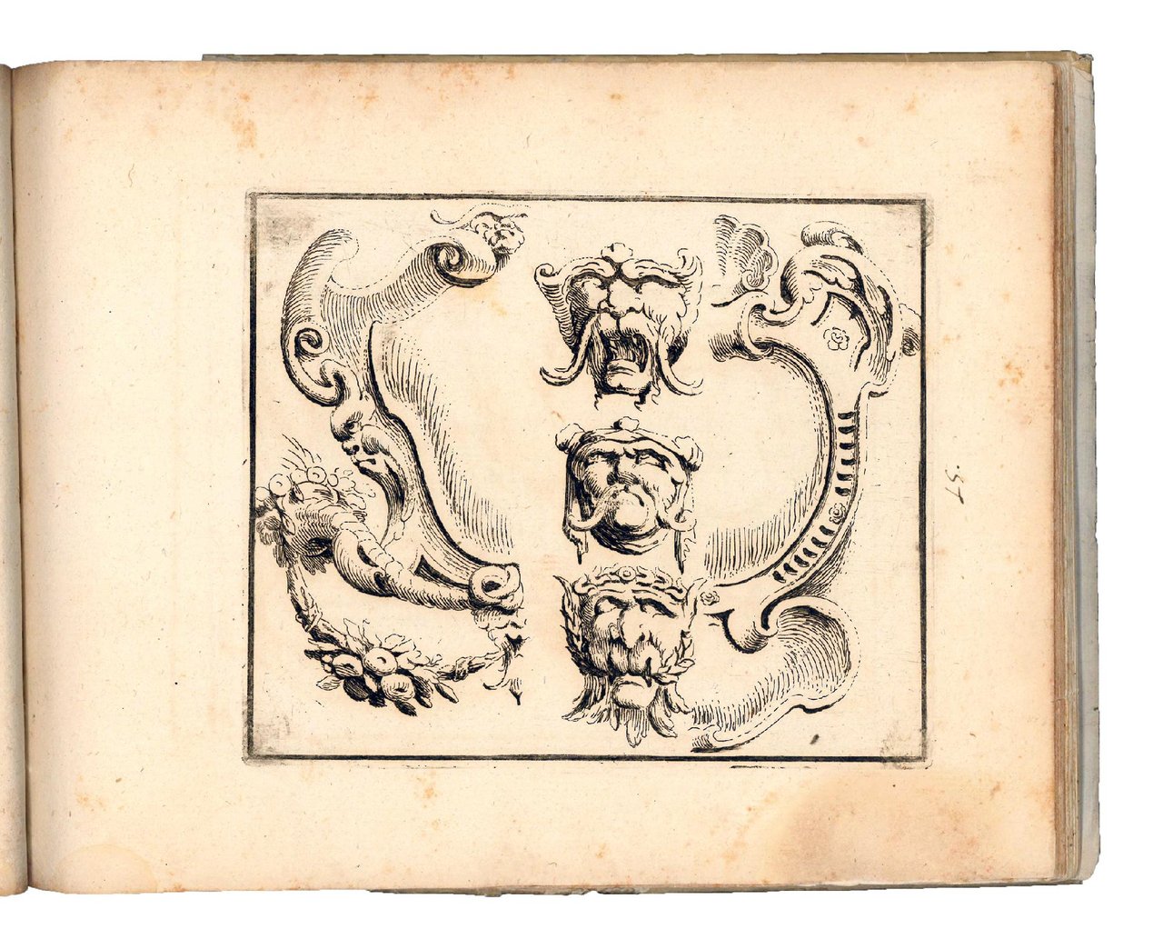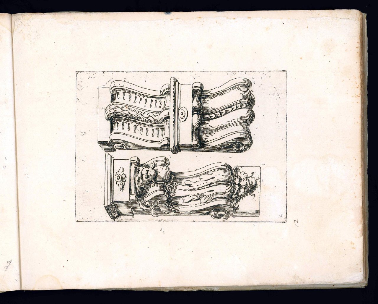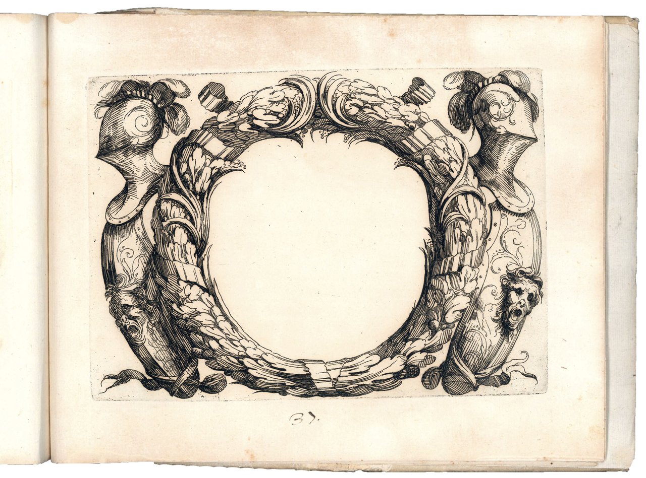 Nice album gathering three extremely rare series of engravings showing architectural ornaments like mouldings, cornices, and cartouches, the first two designed by Domenico Santi, the third by Agostino Mitelli. The painter Domenico Santi, known as Mengazino, was a pupil of Agostino Mitelli and worked mainly in Modena, Mirandola and Novellara.