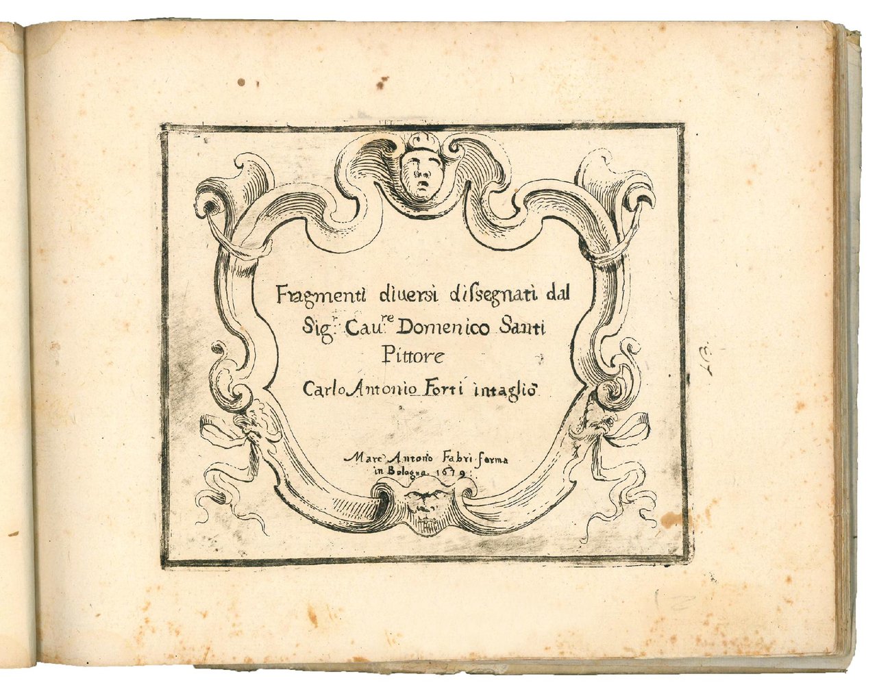 SANTI, Domenico (1621-1694)-FORTI, Carlo Antonio (fl. 17th cent.). Fragmenti diversi disegnati dal Sig.r Cav.re Domenico Santi Pittore. Carlo Antonio Forti intagliò. Bologna, Marco Antonio Fabri, 1679. [13] engraved plates including the title page.