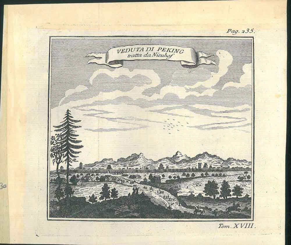 <p>Incisione in rame su carta vergata mm.160x190, parte incisa mm. 120x137 con veduta animata con uomini e cavalli e le mura e torri di Pechino. Immagine tratta da: Storia generale dè viaggi, 1755 circa</p>