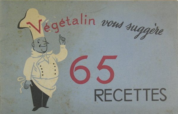 s.d. (vers 1950). In/12 agrafé couverture bleue illustrée, 24 p. Rousseurs sur la couverture. Tirée de la noix de coco, la végétaline est ici déclinée en 65 recettes allant des potages aux pâtisseries.