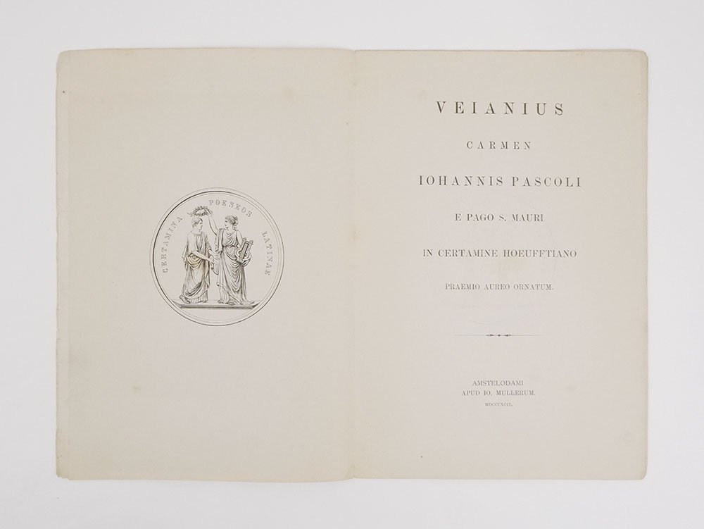 LIBRORara edizione originale nell’emissione autonoma (i componimenti vincitori erano pubblicati anche in un volume collettaneo).Leggere fioriture, in particolare alla brossura, e minimo restauro conservativo al dorso; nel complesso esemplare molto buono. Primo riconoscimento ufficiale al genio latino del Pascoli: il poemetto fu presentato al Certamen Hoeuftianum di Amsterdam nel 1891 e, ottenuta la medaglia d’oro, fu pubblicato nel 1892. Il poeta vinse il premio tredici volte e in sei occasioni ottenne la “magna laus” della giuria; non mancarono tuttavia le occasioni in cui, deluso dalla sola assegnazione della lode, Pascoli si rifiuto` di rivelare il proprio nome, impedendo che i suoi versi fossero pubblicati (i componimenti venivano inviati in forma anonima e solo dopo la dichiarazione del vincitore si potevano stampare i poemetti non premiati ma degni di lode, previa autorizzazione dell’autore). Prendendo spunto da un passo oraziano citato in esergo, il poeta racconta una giornata di Veianio, ex gladiatore ritiratosi nella tranquillità della campagna; addormentatosi, sogna di essere tornato nell’arena e di soccombere a un rivale sconfitto tempo prima.Pascoli, «Poesie e Prose», ed. Garboli, vol. I, pp. 805 e segg.; Pascoli, «Carmina», ed. Valgimigli, pp. 130-5, 604-5, 707. Gambetti - Vezzosi, «Rarità bibliografiche», p. 641.