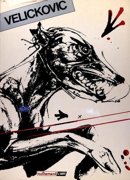 Edtitions Autrement, l’art, 1983. In/4 broché couverture illustrée rempliée, illustrations en noir, 111 pages. Petit défaut en couverture. “Vladimir Velickovic est né à Belgrade (Yougoslavie) en 1935. Diplômé de l’école d’architecture de Belgrade, il s’oriente vers la peinture et réalise sa première exposition personnelle en 1963. Il obtient en 1965 le prix de la Biennale de Paris, ville où s’installe l’année suivante et où il vit et travaille aujourd’hui encore. Il est révélé dès 1967 par une exposition à la galerie du Dragon et apparaît aussitôt comme un des artistes les plus importants du mouvement de la Figuration narrative. Témoin, dans son enfance, des atrocités commises par les nazis en Yougoslavie, il a été marqué pour la vie, et il a voué sa peinture à la représentation du corps. Déchiré, mutilé, secoué par des douleurs atroces, voué à d’épuisantes courses sans issue, éventuellement métamorphosé en chien ou en rat, le corps de l’homme est un champ d’investigation inépuisable pour Velickovic.”