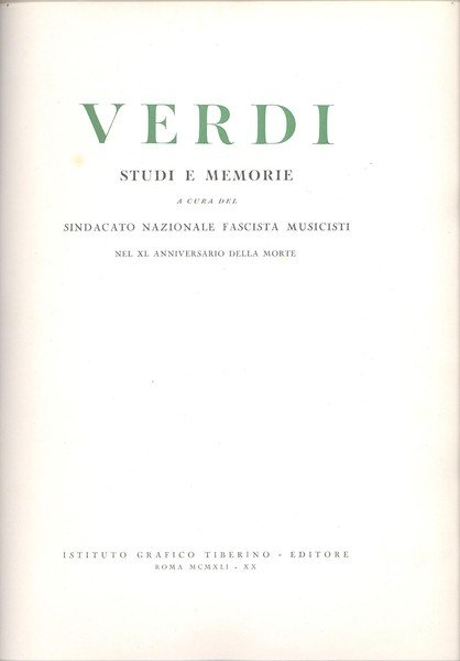 IN 4°,pp.532, COPERTINA EDITORIALE CARTONATA RIGIDA GRIGIA CON TITOLO IN ROSSO<BR>RIPORTATO ANCHE AL DORSO. RARA MONOGRAFIA SUL GRANDE MUSICISTA DI BUSSETO - STUDI E MEMORIE A CURA DEL SINDACATO NAZIONALE FASCISTA MUSICISTI NEL XL ANNIVERSARIO DELLA MORTE. MOLTO INTERESSANTE LA PARTE FINALE CON IL CATALOGO DELLE MEDAGLIE VERDIANE. TIRATURA LIMITATA A 700 ESEMPLARI SENZA CONTRASSEGNO DI SORTA. PERFETTA CONSEVAZIONE. ID, 490.