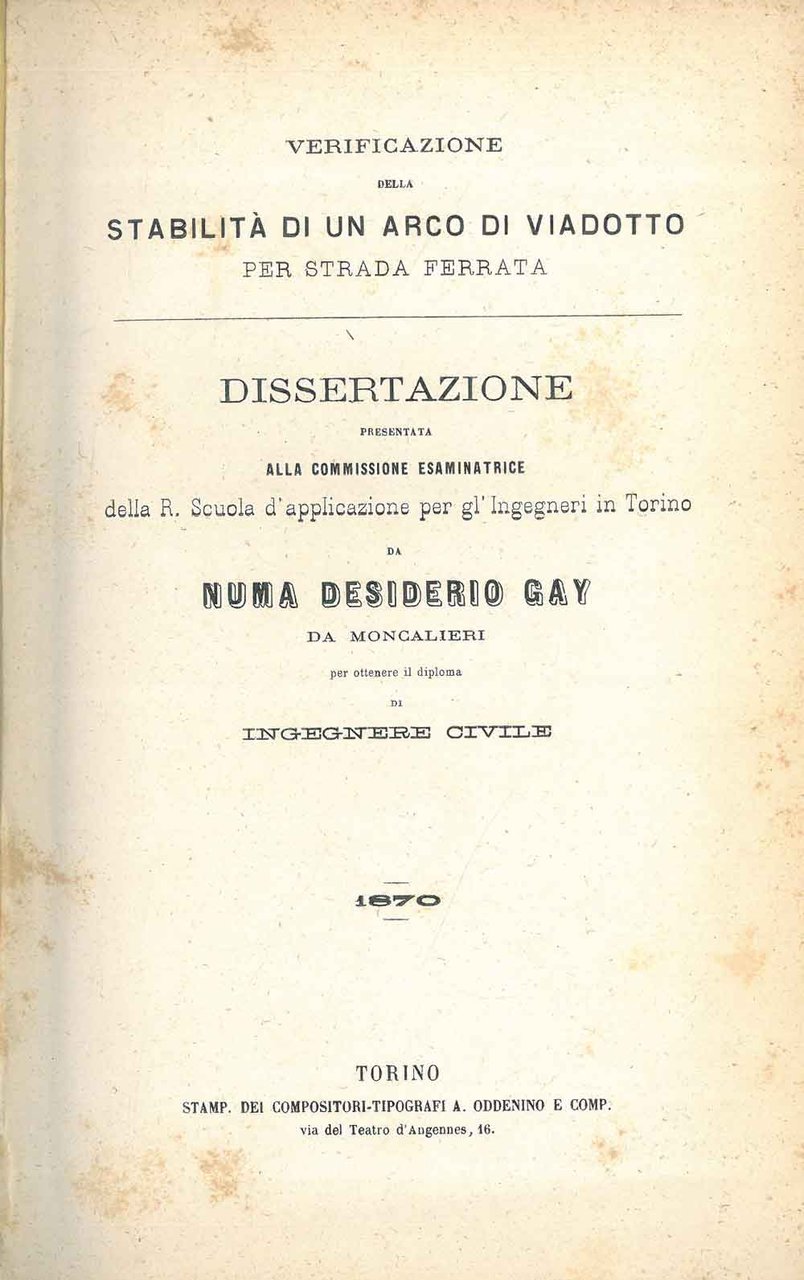 Verificazione della stabilità di un arco di viadotto per strada ferrata. Dissertazione. alla R. Scuola d'applicazione per gl'ingegneri in Torino