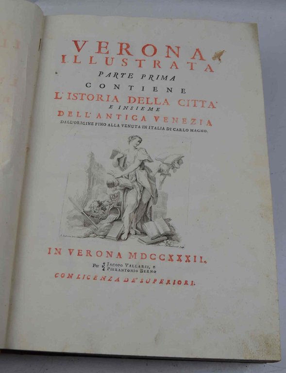 Quattro parti in un volume in-folio (cm. 43,5), ognuna con proprio frontespizio in rosso e nero con grande incisione centrale. Pp. xii, colonne 396; x, col. 298; iv, col. 294, (3); (6) col. 214 (1) cb. + (2) di correzioni e giunte. Con bei capolettera, decorazioni tipografiche 67 incisioni in rame nel testo anche a piena pagina raffiguranti fregi, monete, monumenti, epigrafi, sculture (fra queste anche i 12 busti antichi disegnati da Giambattista Tiepolo). Solida legatura ottocentesca in mezza pelle, dorso a nervi con titoli e filetti in oro. Pochi segni d'uso esterni, peraltro esemplare. marginoso ed in ottimo stato di conservazione. Celebre e sontuosa edizione originale di quest'importante fonte storica per la città di Verona. Ognuna delle quattro parti è monograficamente dedicata ad un aspetto: La prima parte contiene "L'istoria della città e insieme dell'antica Venezia"; la seconda "L'istoria letteraria o sia notizie de'scrittori veronesi"; la terza "La notizia delle cose in Verona più osservabili"; la quarta "Il trattato degli anfiteatri, e singolarmente del veronese".