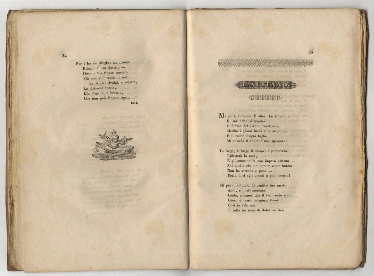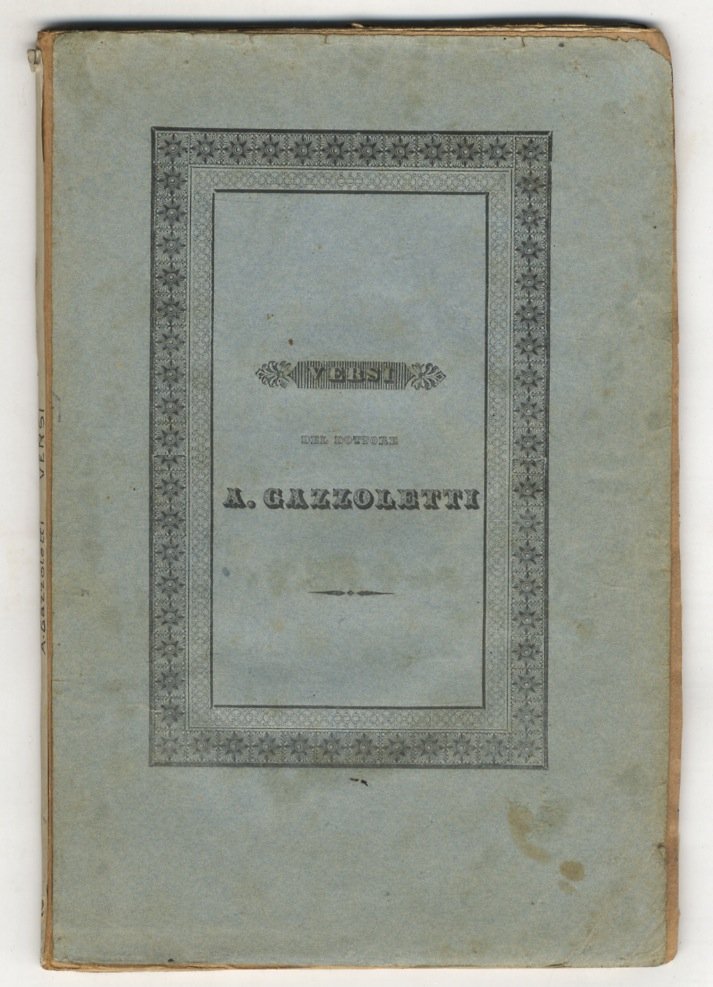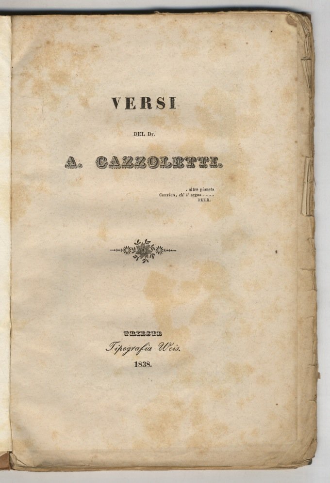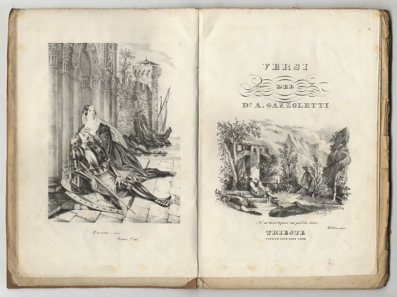 Trieste, Tipografia Weis, 1838, in-8, brossura editoriale, dorso rifatto, copertine controfondate, pp. 95. Con primo frontespizio e un'antiporta figurati in litografia.
