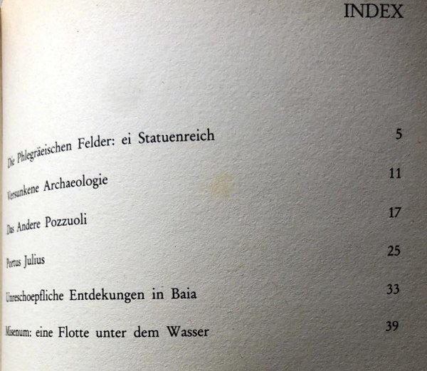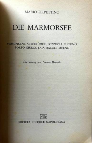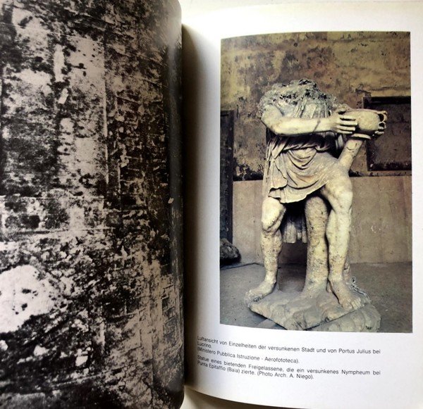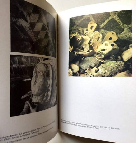 Soggetti: Archeologia subacquea, Parco Archeologico, Antichità, Oggetti ritrovati, Mare flegreo, Reperti archeologici sottomarini, Ritrovamenti, Campi Flegrei, Scavi, Statue marmoree, Statuette, Vasellame, Cocci, Regno sommerso, Mari, Mosaici, Statue, Templi, Domus, Vestigia, Immagini, Iconografia, Fotografie, Navi sommerse, Imbarcazioni, Mosaici, Pietre tombali, Vulcano, Vesuvio, Pilastri, Ville, Relitti, Vascelli, Statuine, Argento, Oro, Lucullo, Caligola, Flegetonte, Lusso, Sesterzi, Monete, Sabbia, Cesare, Acque, Caligola, Spiaggia, Fusaro, The Sea of Marble: Submerged Antiquities, La mer de marbre: antiquities [sic] submergées, Lucrino, Pozzuoli, Napoli, Campania, Italia meridionale, Storia, Scienze, Arte, Impero romano, Imperatori, Nerone, Baia, Bacoli, Miseno, Personaggi storici, Libri Vintage, Fuori catalogo, Libri in tedesco, Bradisismo, Portus Julius, Men lands and sea, Tesori sommersi, Geschichte, Neapel, Statuen, Ausfuhrung, Villen, Saulenkopfe, Grabsteine, Fleisch, Korpers, Vulkans, Ruheit, Verfliehen, Zeit, Pontile Pirelli, Mosaik, Gruppo Archeosub Campano, Puteoli, Averno, Misenum, Cumae, Punta Epitaffio, Flotte, Wasser, Unreschoepfliche, Entdekungen, Die Phlegraeischen, Statuenreich, Turismo, Viaggio, Collezionismo, Underwater archeology, Archaeological park, Antiquities, Objects found, Phlegrean sea, Underwater archaeological finds, Findings, Phlegraean fields, Excavations, Marble statues, Pottery, Shards, Underwater kingdom, Seas, Mosaics, Statues, Temples, Domus, Vestige, Images, Iconography, Photographs, Submerged ships, Boats, Gravestones, Volcano, Vesuvius, Pillars, Villas, Wrecks, Vessels, Statuettes, Silver, Gold, Lucullus, Caligula, Luxury, Sesterzi, Coins, Sand, Caesar, Waters, Caligula, Beach, Naples, Southern Italy, History, Science, Art, Roman Empire, Emperors, Nero, Historical figures, Books out of, Bradisism, Tourism, Travel, Collectibles