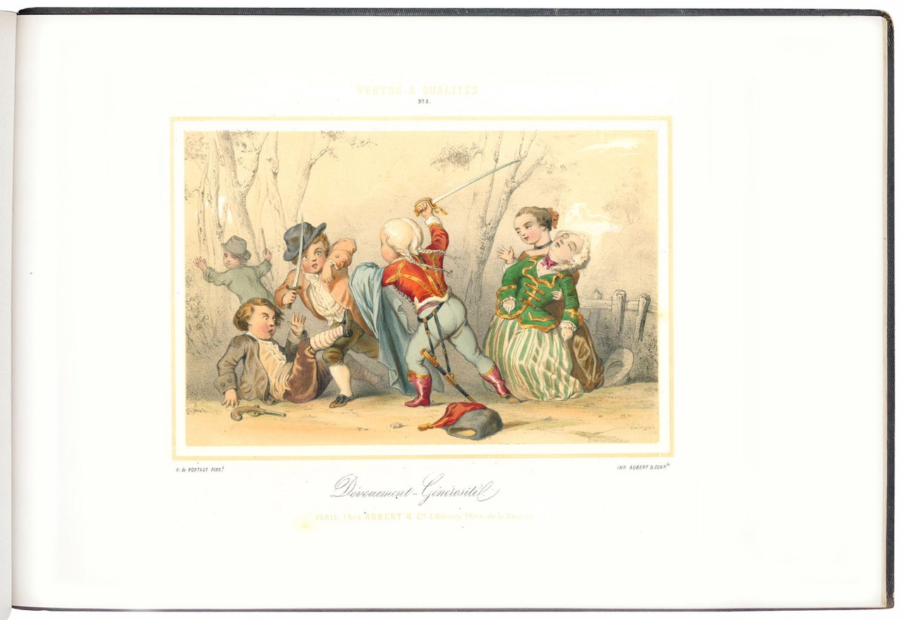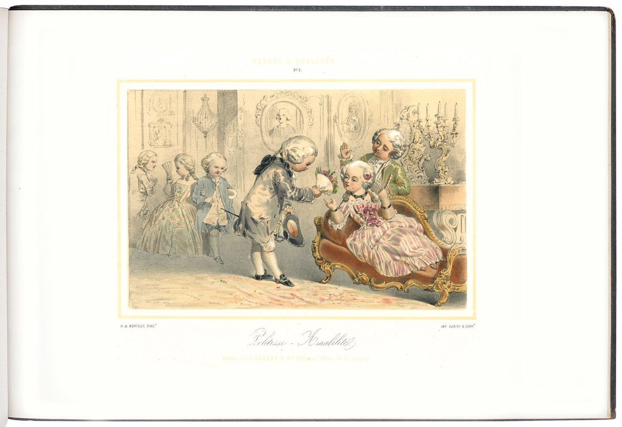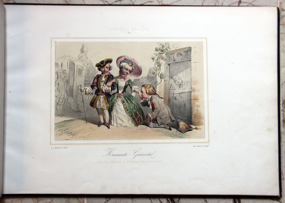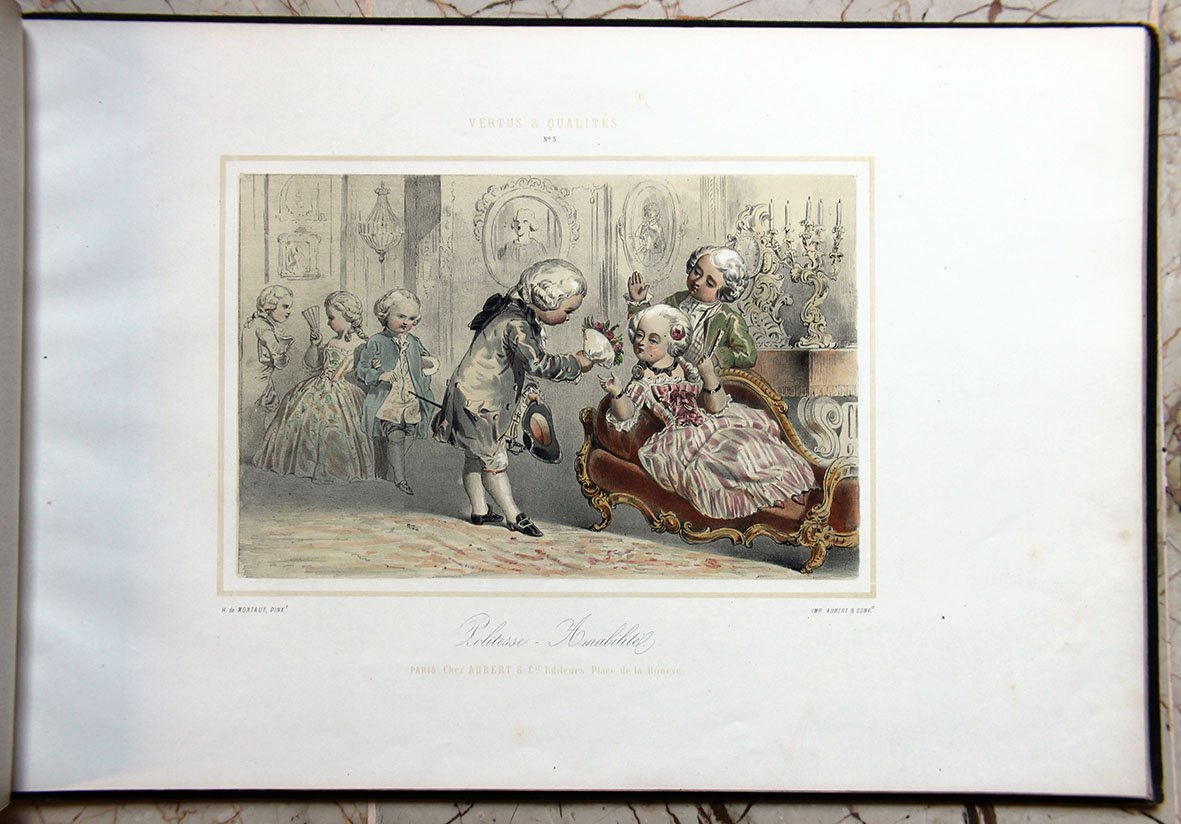 Prima edizione, nella rara variante a colori, stampata dalla celebre litografia parigina Aubert & Cie., che pubblicò anche il volume compagno di questo dedicato ai vizi (Defauts et Vices). Le tavole mostrano bambini vestiti in sontuosi abiti Ancien Regime intenti ad inscenare con effetti comici virtù da adulti: 1. Humanité – Générosité, 2. Etude – Talente, 3. Politesse-Amabilité, 4. Travail – Savoir, 5. Dévouement-Générosité, 6. Valeur-Courage, 7. Adresse-Précision, 8. La Propreté, 9. Plaison-Philanthropie, 10. Bonté-Bienfaisance, 11. La Poiété, 12. Le Dévouement.