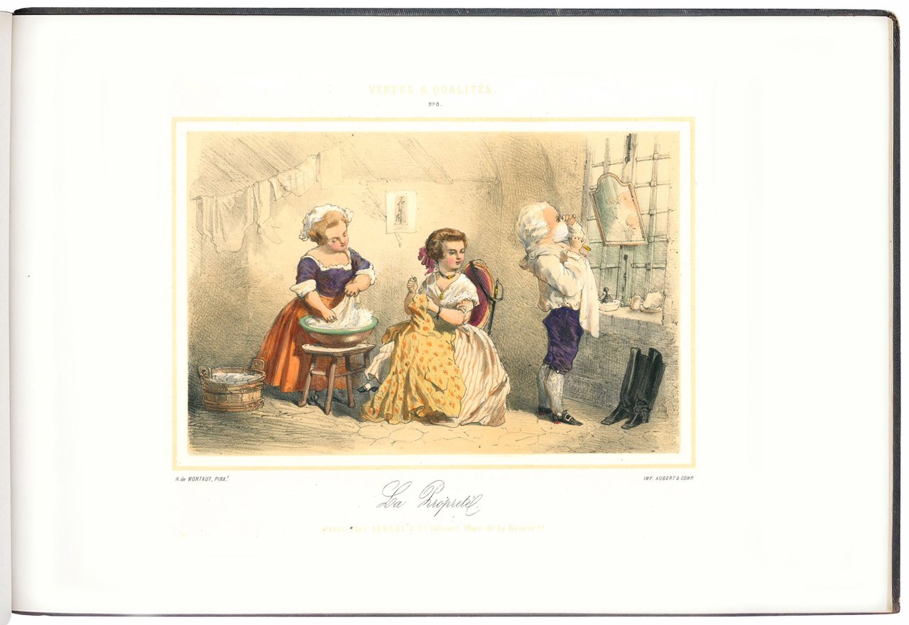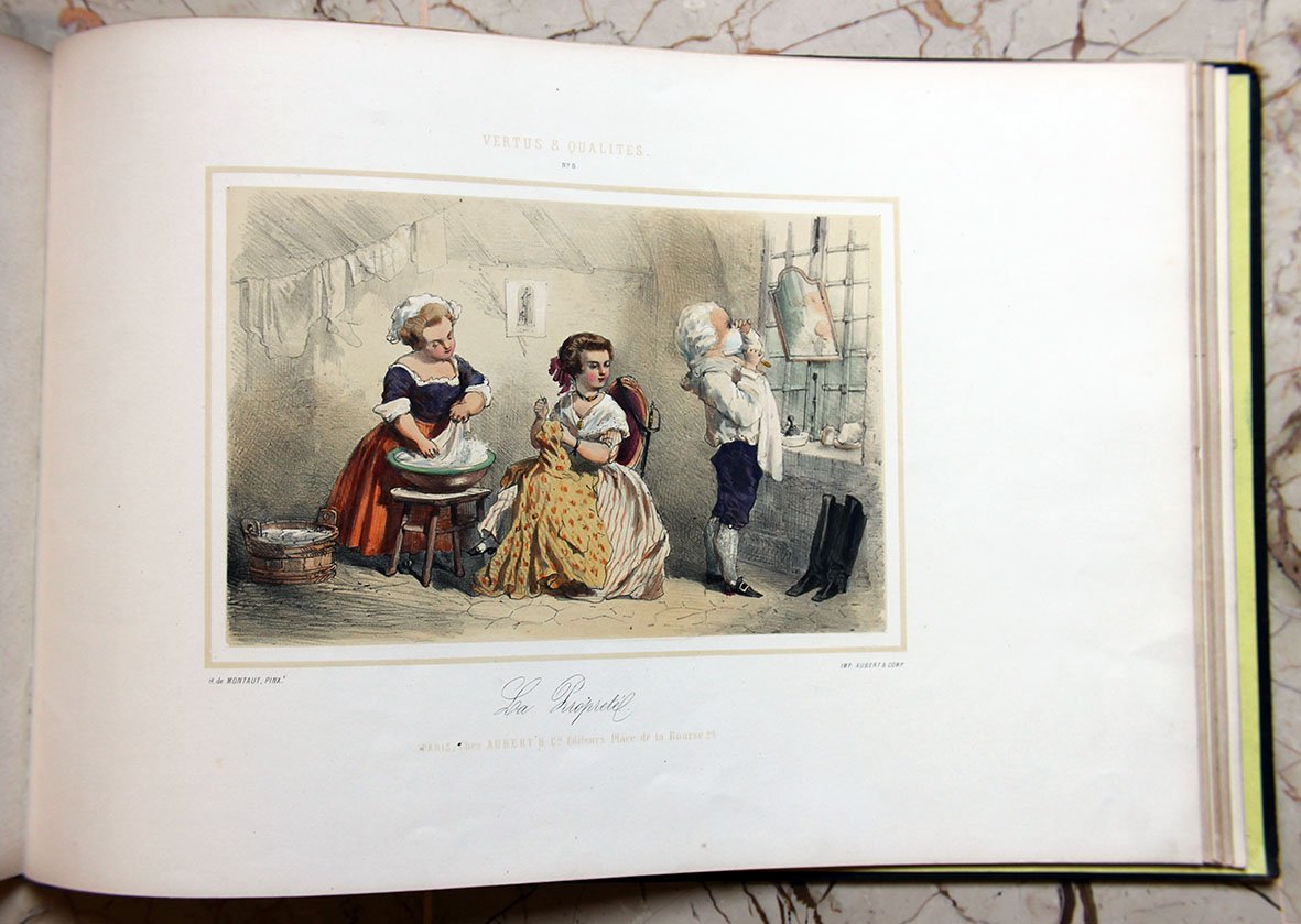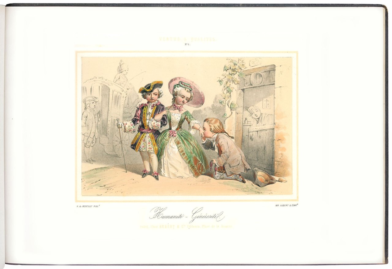 Prima edizione, nella rara variante a colori, stampata dalla celebre litografia parigina Aubert & Cie., che pubblicò anche il volume compagno di questo dedicato ai vizi (Defauts et Vices). Le tavole mostrano bambini vestiti in sontuosi abiti Ancien Regime intenti ad inscenare con effetti comici virtù da adulti: 1. Humanité – Générosité, 2. Etude – Talente, 3. Politesse-Amabilité, 4. Travail – Savoir, 5. Dévouement-Générosité, 6. Valeur-Courage, 7. Adresse-Précision, 8. La Propreté, 9. Plaison-Philanthropie, 10. Bonté-Bienfaisance, 11. La Poiété, 12. Le Dévouement.