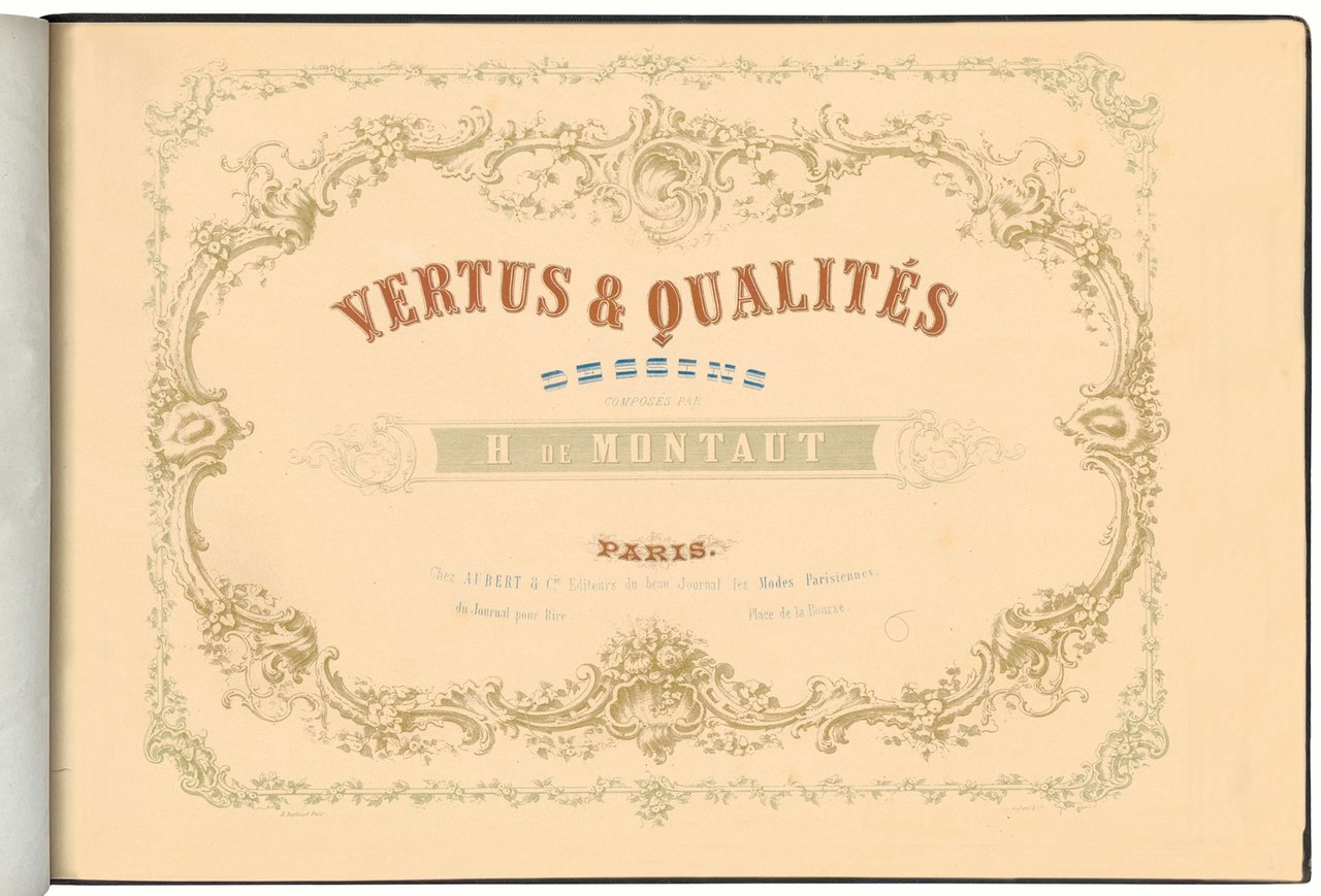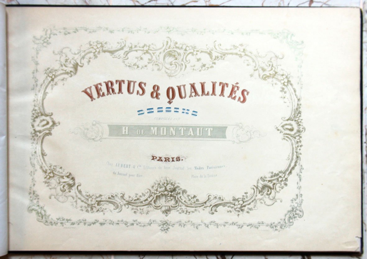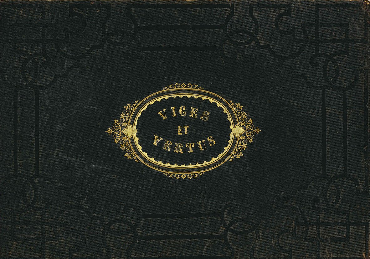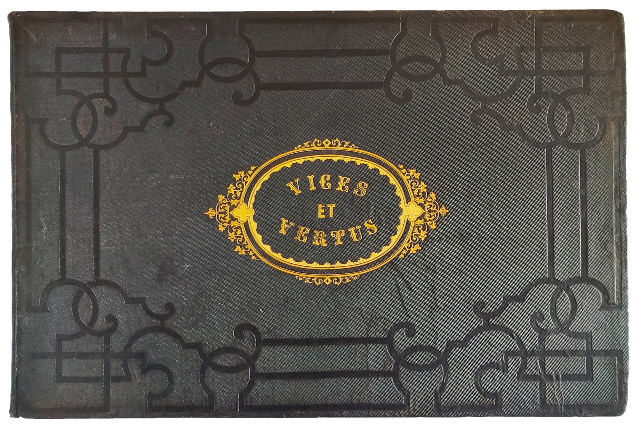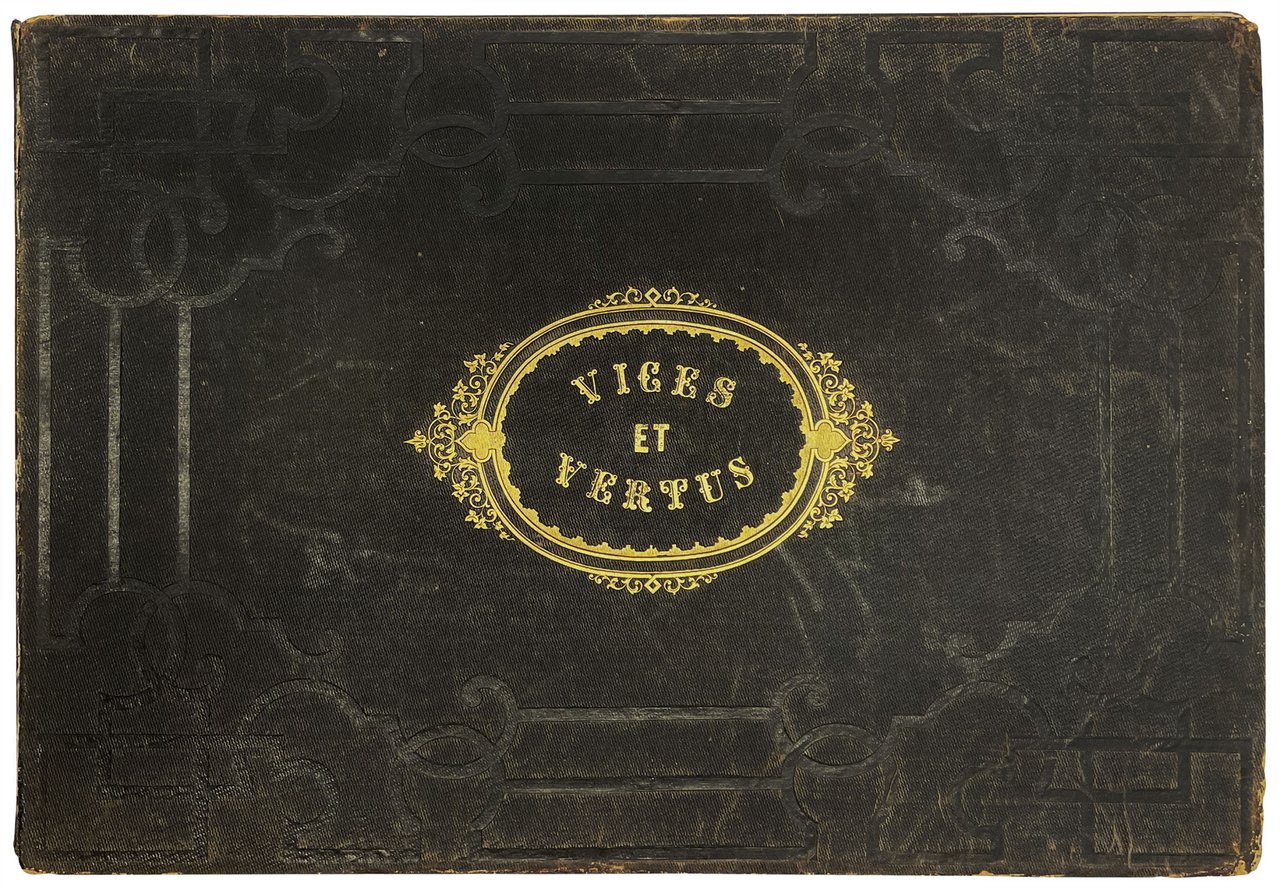 Album di mm. 291x428; tela editoriale nera con decorazioni ad arabesco impresse a secco sui piatti, titolo in oro (Vices et Vertus) entro cartouche dorata al piatto superiore, fregio in oro al centro del piatto posteriore, risguardi in carta gialla, tagli dorati (dorso abilmente restaurato). Frontespizio stampato a più colori e 12 tavole litografiche a colori intervallate da carte protettive (Montaut pinx.-Aubert & Cie. imp.). Ottima copia.