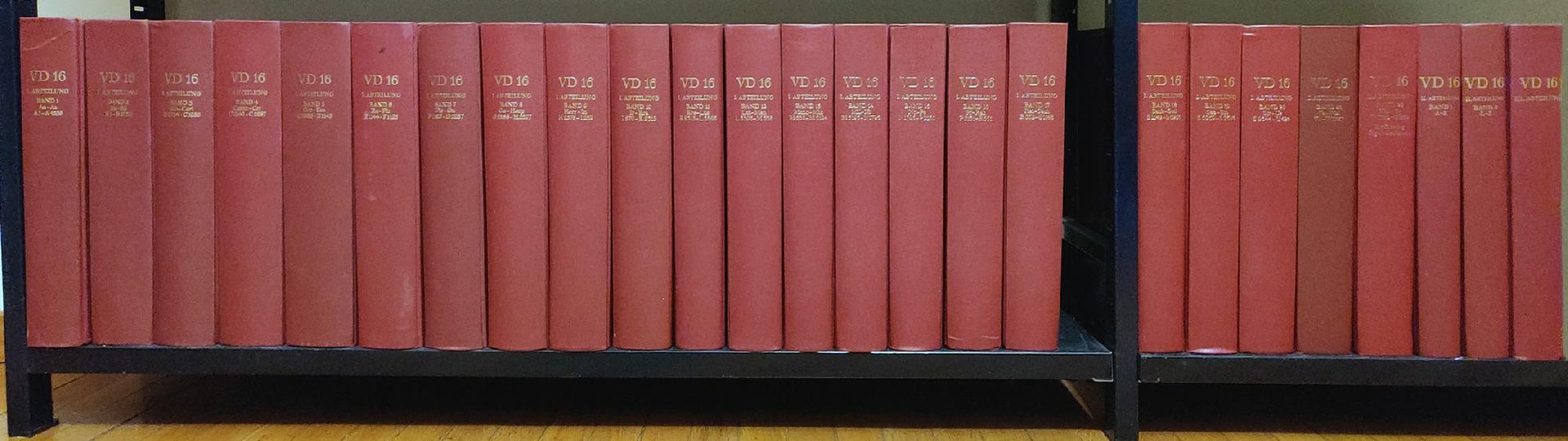25 volumi in folio. Legatura editoriale in tela Bordeaux con titoli in oro. Per il monumentale progetto "Verzeichnis der im deutschen Sprachbereich erschienenen Drucke des 16. Jahrhunderts" (Indice delle opere a stampa del XVI secolo pubblicate nelle aree di lingua tedesca), nel 1969 furono creati due gruppi di lavoro presso la Bayerische Staatsbibliothek di Monaco e presso la Herzog August Bibliothek di Wolfenbüttel, ciascuno con il compito di catalogare e descrivere tutte le opere a stampa apparse nel XVI secolo in tutte le aree di lingua tedesca, ossia Germania, Alsazia, Austria e Svizzera tedesca), indipendentemente dalla lingua del testo. I tre volumi finale di indice comprendono tre sezioni: I. Autori, Società, Anonimi; II. Editori, commentatori, traduttori, collaboratori letterari; III. Luoghi di stampa, tipografi, editori. Ottima copia.