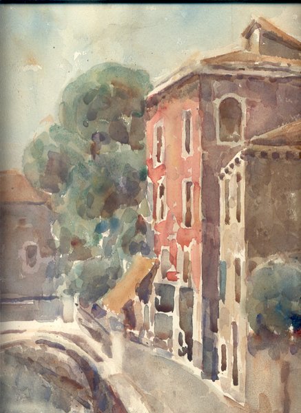 Acquarello su carta con cornice coeva di legno scuro, raffigurante canale con ponte e via con palazzi e alberi. Dimensioni dipinto cm. 38 x 28,5. Dimensioni cornice cm. 47 x 37. Firma in basso a destra.