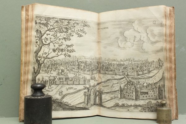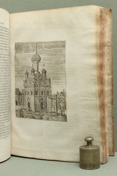Due parti in un volume in - 4ø; 2 cc., 222 pp., 1 c. con vignetta incisa in rame da G.B. Galestrucci in fine, 6 tavv. incise in rame fuori testo (perlopi— ripiegate) compresa una carta geografica, molte firmate con monogramma "A.S."; testo su due colonne. Legatura coeva in tutta pergamena morbida, titolo manoscritto al dorso (sbiadito). Occasionali lievi fioriture. Bell'esemplare. Prima edizione italiana, rara, dei Viaggi di Moscovia dell'Olearius ed edizione originale della Relatione di Moscovia del Barberini (pp. 191 - 222). Quest'ultima, datata 1565 e rimasta a lungo manoscritta, si presenta sotto forma di lettera indirizzata al conte di Nubarola: l'autore racconta il proprio viaggio a Mosca, riportando notizie storiche relative all'area di Polonia, Lituania e Russia. Adam Olearius fu inviato nel 1633 da Federico III Duca di Holstein a Mosca e in Persia per stringere accordi commerciali rispettivamente con lo Zar e con il Re. Pubblicato per la prima volta a Schleswig nel 1646 il libro contiene la descrizione delle regioni visitate, da Amburgo a tutti i paesi dell'area baltica riportando notizie sulle popolazioni, le feste, i costumi, l'organizzazione amministrativa. Il testo Š corredato da grandi e belle tavole incise in rame che rappresentano i vari momenti dell'ambasceria, la processione dei moscoviti, una chiesa ortodossa, la grande pianta della citt… di Mosca, la citt… di Novogordia, nonch‚ dalla carta geografica dei Paesi che si affacciano sul Mar Baltico. NYPL, 'Russia Engages The World', 14 and 18.