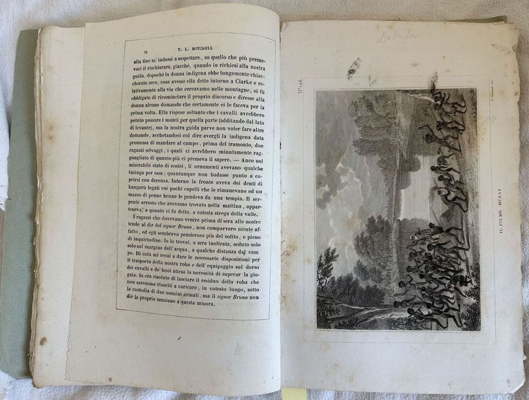 Edizione italiana del 1844 di questo resoconto di viaggio in Australia dell'esploratore scozzese Thomas Livingstone Mitchell (1792-1855) della collana "Raccolta di viaggi dalla scoperta del Nuovo Continente fino a di nostri". L'opera è in un volume ed è completa. All'interno sono presenti alcune incisioni: Cascata di Coraw, Picco di Tangula, Il fiume Muray, Primo incontro del capo del Selvaggi del Eugan, Monti Arapili, Il fiume Yarrayne, Valle del Grose, Il fiume Darling, Il fiume di Glenelg ecc. In buone condizioni, privo di legatura. Copertina morbida posticcia in buone condizioni generali con lievi usure ai margini e dorso. Legatura in buone condizioni. Pagine in buone condizioni con rare fioriture. In 8. cm 26x17. Pp. 282+(2)+13 pl.First italian edition of 1844 of the resuming of travel in Australia by the scottish explorer Thomas Livingstone Mitchell (1792-1855) of the series "Raccolta di viaggi dalla scoperta del Nuovo Continente fino a di nostri". The work is in one volume and it is complete. Inside there are some engravings: Cascata di Coraw, Picco di Tangula, Il fiume Muray, Primo incontro del capo del Selvaggi del Eugan, Monti Arapili, Il fiume Yarrayne, Valle del Grose, Il fiume Darling, Il fiume di Glenelg ecc. In good conditions, boundless. Soft false cover in good conditions lightly worn in the extremities. Binding is missing. Pages in good conditions with occasional foxing. In 8. cm 26x17. Pp. 282+(2)+13 pl.