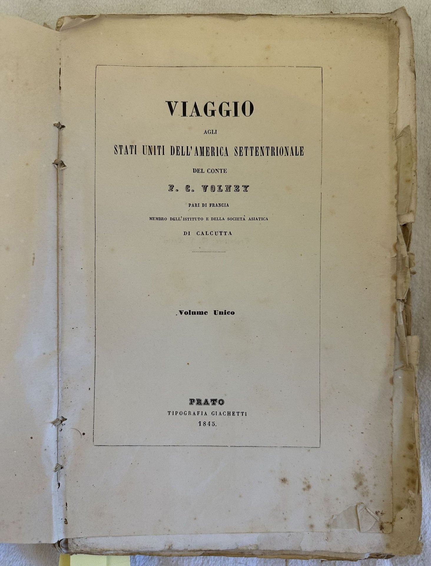 Interessante opera del 1845 della collana "Raccolta di viaggi di Marmocchi" di questa raccolta di due opere legate insieme in un unico volume. La prima è un resoconto di viaggio negli Stati Uniti dello storico e filosofo francese Constantin Francois Volney (1757-1820). All'interno: studio sui selvaggi o indiani dell'America Settentrionale, Estratto dalla storia greca di Tucicide, Studio sulla fisica e la geografia degli Stati Uniti dell'America settentrionale, Laghi, Cascata di Niagara, Ohio e Mississipi, Golfo del Messico, Malattie dominanti negli Stati Uniti, Florida, New Hampshire, Vermont, Gallipoli colonia francese sull'Ohio, New England, New York, Mariland, Carolina, Pennsylvania, Stati Uniti ecc. All'interno sono presenti che mostrano vedute e ritratti (Volney, Consiglio dei capi dei selvaggi, Cataratta di Niagara, Prime coltivazioni in America, Franklin, Washington). La seconda opera del 1845 Ë un viaggio in Mesopotamia di Caldea e Assiria del colonnello Francis Rawdon Chesney e viaggo a Meroe in Etiopia di Hoskins. All'interno: Consiglio dei Capi dei Selvaggi, Cataratta di Niagara ecc. La seconda opera del 1845 Ë un viaggio in Mesopotamia di Caldea e Assiria del colonnello Francis Rawdon Chesney e viaggo a Meroe in Etiopia di Hoskins. All'interno: Consiglio dei Capi dei Selvaggi, Cataratta di Niagara ecc. In discrete condizioni e completo. Copertina morbida coeva con titolo manoscritto al piatto anteriore in buone condizioni generali con lievi usure ai margini e dorso. Legatura in buone condizioni ma rimosso dalla copertina originale. All'interno le pagine si presentano in buone condizioni con rare fioriture. In 8. Dim. 25,5x17,5 cm. Pp. 190+70+(4). Interesting work of 1845 of the series "Raccolta di viaggi di Marmocchi" of this collection of two works bound together in the same volume. The first one is the travel in United States of America by the french historian and phylosopher Constantin Francois Volney (1757-1820). Inside: study about wild people or indians of Northern America, Extract from greek history of Tucicide, Study about physics and geography of United States of Northern America, Lakes, Niagara, Ohio and Mississipi, Gulf of Mexico, Main deseases in United States, Florida, New Hampshire, Vermont, Gallipoli french colony on Ohio, New England, New York, Mariland, Carolina, Pennsylvania, United States etc. Inside there are some views showing views and portraits (Volney, Council of chiefs of wild men, Niagara, First cultivations in America, Franklin, Washington). The second work of 1845 is a travel of Mesopotamia of Caldea and Assiria of colonnello Francis Rawdon Chesney and travel in Meroe in Aethiopia of Hoskins. Inside: Council of Heads of wild men, Niagara ecc. In fair conditions and complete. Soft coeval cover with handwritten title in the front plate in good general conditions lightly worn in the extremities. Binding in good conditions but removed from the original cover. Inside pages are in good conditions with occasional foxings. In 8. Dim. 25,5x17,5 cm. Pp. 190+70+(4).
