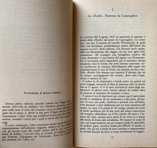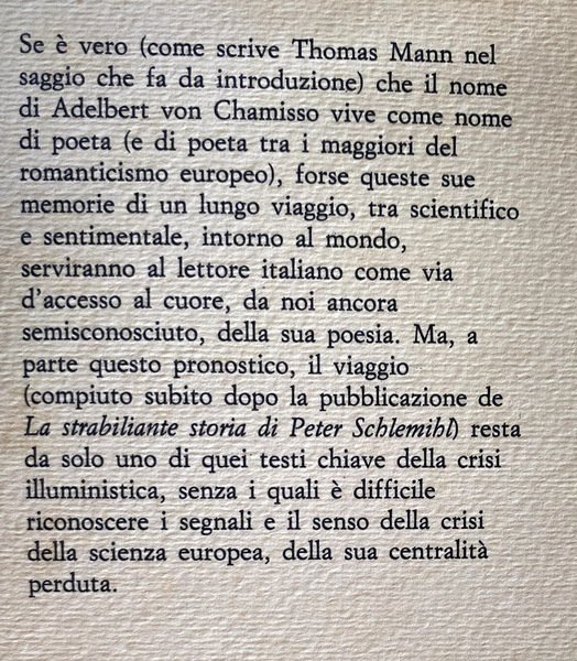 Adalbert von Chamisso (1781-1838) è forse il più tipico - biograficamente parlando - esponente del romanticismo tedesco. Se non fosse per il fatto di vivere oltre la giovinezza, sarebbe davvero un prototipo del letterato di quegli anni: impegnato nelle scienze, nella vita militare come nella letteratura, cui si dedica in momenti diversi della sua vita, ottiene fama postuma e non per le attività che lo tennero impegnato per la maggior parte della sua vita. Come poeta è ricordato praticamente da tutti i suoi successori tedeschi - cosa notevole anche perché lui era di madrelingua francese; come narratore ha lasciato la Storia straordinaria di Peter Schlemihl, fondamentale romanzo della cultura europea, e queste memorie di viaggio per nave, svolte come botanico di bordo.