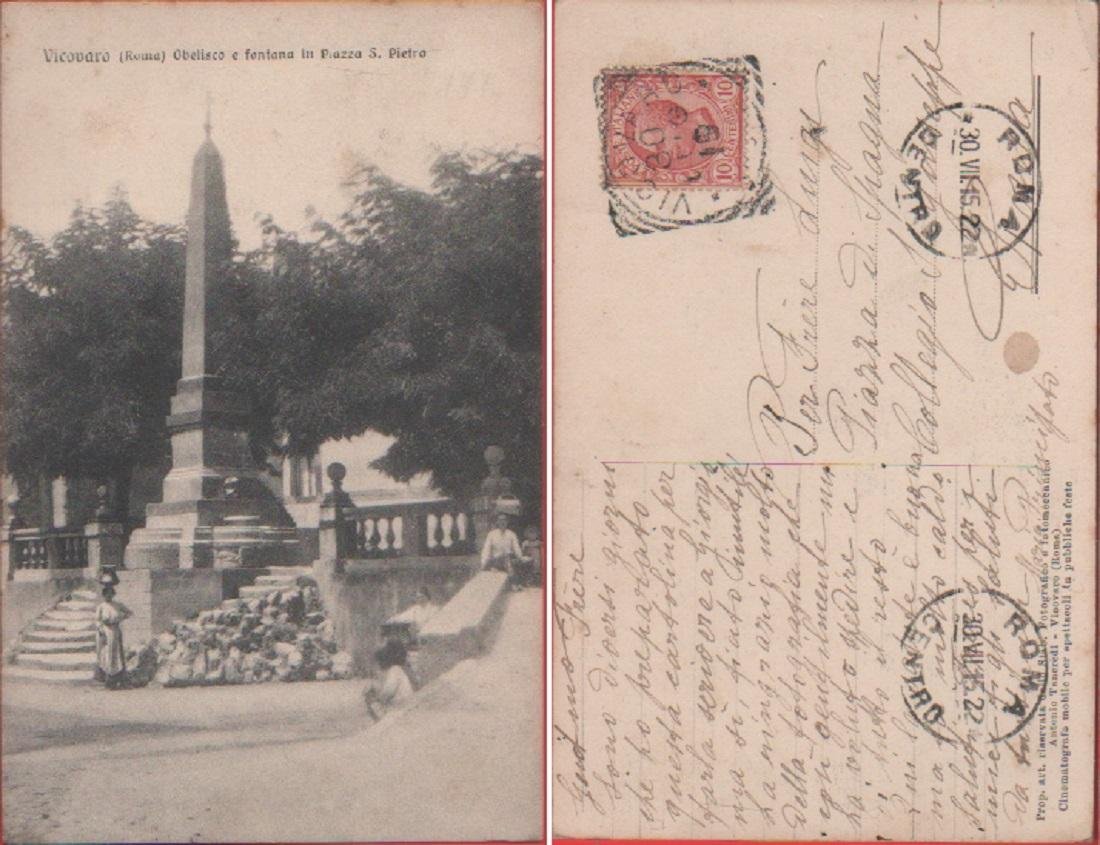 Vicovaro (RM). Obelisco e fontana in piazza S. Pietro. Viaggiata 1915. Animata