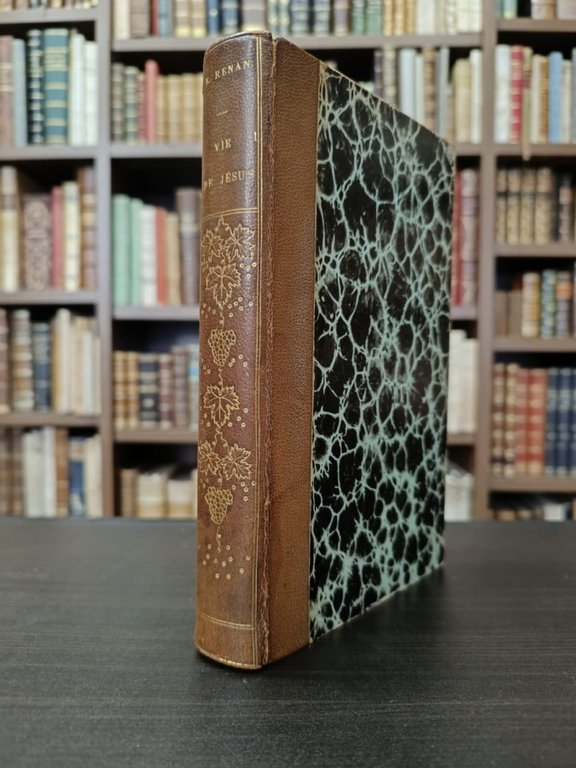 <span style="font-style: normal;">In-8° (cm. 22), gradevole legatura coeva in mezza pelle bruna, dorso liscio con titolo e fregi in oro entro cornici di doppi filetti sempre in oro (usure alle cerniere), piatti marmorizzati (lievi tracce d'uso), taglio superiore dorato; pp. [4] LIX [1b] 462 [2] in stato molto buono; antica firma di possesso al foglio di guardia, lievi e sporadiche fioriture. Edizione originale di questo capolavoro di Renan, che costituisce il primo tentativo di scrivere una biografia di Gesù come personaggio storico e sostiene con forza l'idea che anche la Bibbia possa essere soggetta a indagine critica. Collana </span><i>Histoire des origines du Christianisme</i>, vol. I. Cfr. Carteret II, 250; Vicaire VI, 1016. Esemplare molto buono. (NH6)