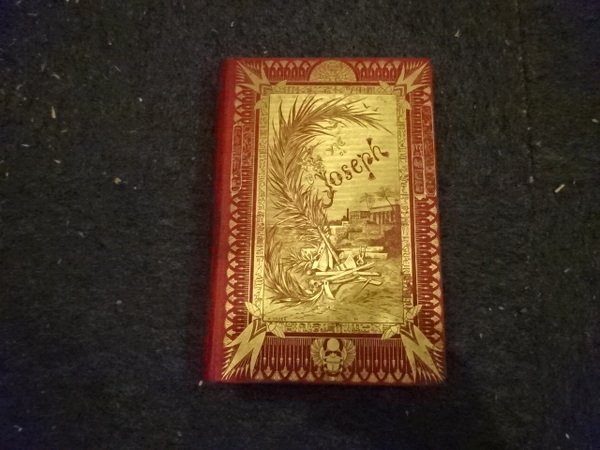 Bruxelles - Genève, Victor Palmé Éditeur, 1883; in-4, XX-410 pp., cartonnage d'éditeur rouge imprimé en or, dos lisse, plats ornés et imprimés ainsi que le dos, tranches dorées (quelques rousseurs). La maquette est de A. Souze, elle représente les outils du charpentier, avec un entourage qui fait penser aux hiéroglyphes égyptiens (pour évoquer la fuite en Egypte). Ouvrage d'érudition religieuse. Biographie remarquable du père terrestre de Jésus-Christ. Magnifique ouvrage imprimé dans des encadrements, avec ornementation. L'impression a été exécutée à Rennes, par Alphonse Le Roy Fils, pour la Société générale de Librairie catholique. Victor Palmé était l'éditeur des Bollangistes. Très rare dans le cartonnage de A. Souze qui travaillait également pour Hetzel. Nombreuses illustrations en noir et blanc in texte et hors-texte pour la plupart signées Poirson, mais avec d'autres artistes, comme Chovin, de Bar, Juillerat, d'Argent, Fichut, Scott, Edwards. Très bon état.