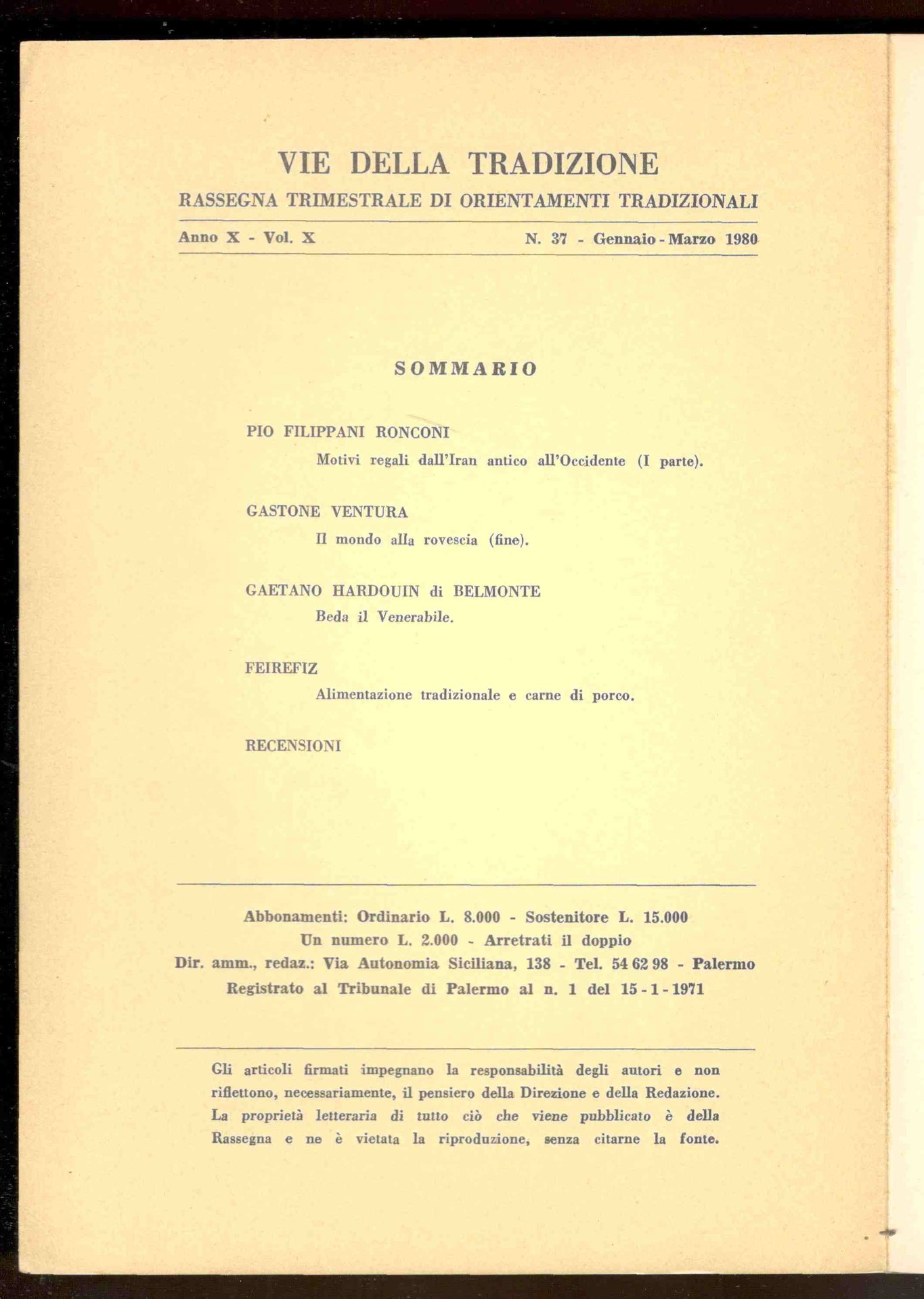 Vie della tradizione. Rassegna trimestrale di orientamenti tradizionali. Anno IX - Vol. X. N. 37. Gennaio-Marzo 1980 | Libri antichi e moderni | Cannizzo, Gaspare (Direttore)