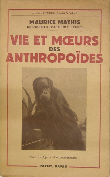 Payot, Paris. 1954. Grand In-8 broché, 198 p., 20 figures dans le texte et 8 planches de photos hors-texte. Excellente étude fort détaillée sur les anthropoïdes, avec la description de leur anatomie et physiologie comparée ; le comportement psychique des singes ; leur utilisation en médecine expérimentale ; la capture des anthropoïdes au Cameroun.