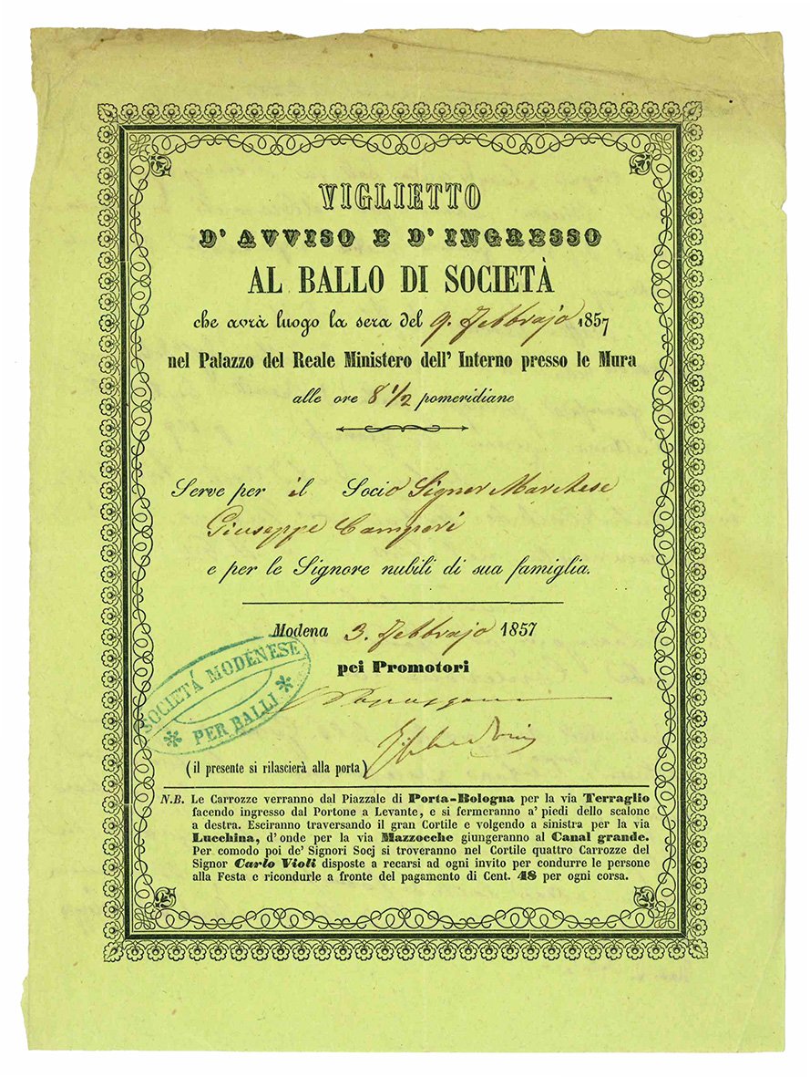Viglietto d'avviso e d'ingresso al ballo di società che avrà luogo la sera del 9 Febbraio 1857 nel Palazzo del Reale Ministero dell'Interno presso le Mura alle ore 8½ pomeridiane. Serve per socio Signor Marchese Giuseppe Campori e per le Signore nubili della sua famiglia.