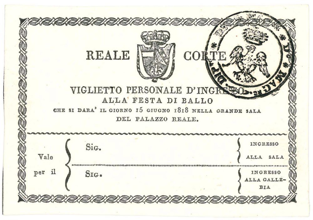 Viglietto personale d'ingresso alla festa di ballo che si darà il giorno 15 giugno 1818 nella grande sala del Palazzo Reale