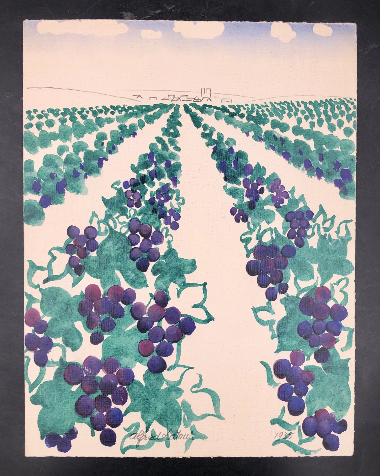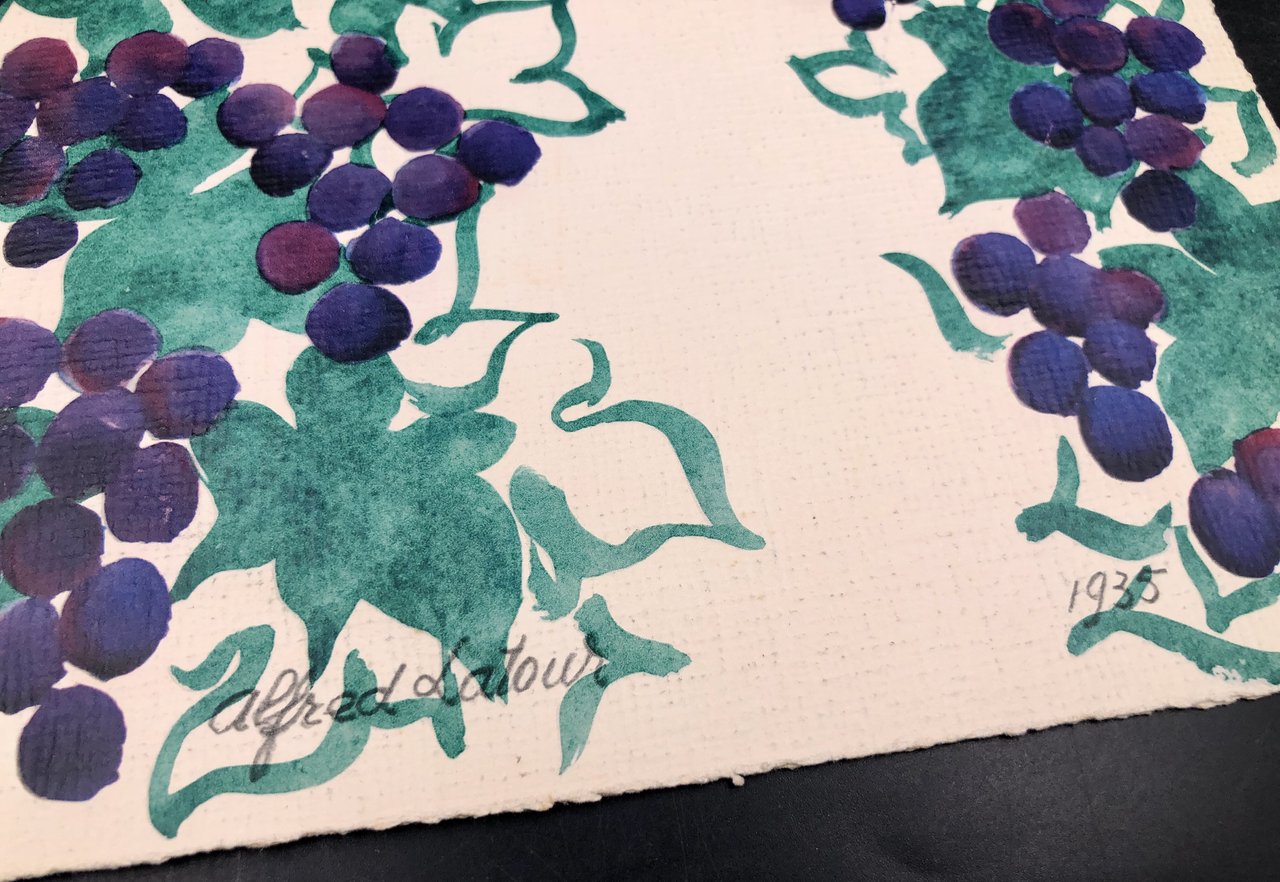 Doppio foglio in cartoncino tipo carta da disegno di cm. 30,3x23, impresso con la magistrale riproduzione dell'acquerelo a colori, e, all'interno con i prezzi di 4 titpi cu champne, alla qurta facciat il nime della ditta. LATOUR, grafico , cartellonista, illustratore e pittore francese, "notoriously against the opposition between so-called major and minor arts, and was passionate about all the expressive possibilities of visual arts, crafts, and modes of expression" (wiki).