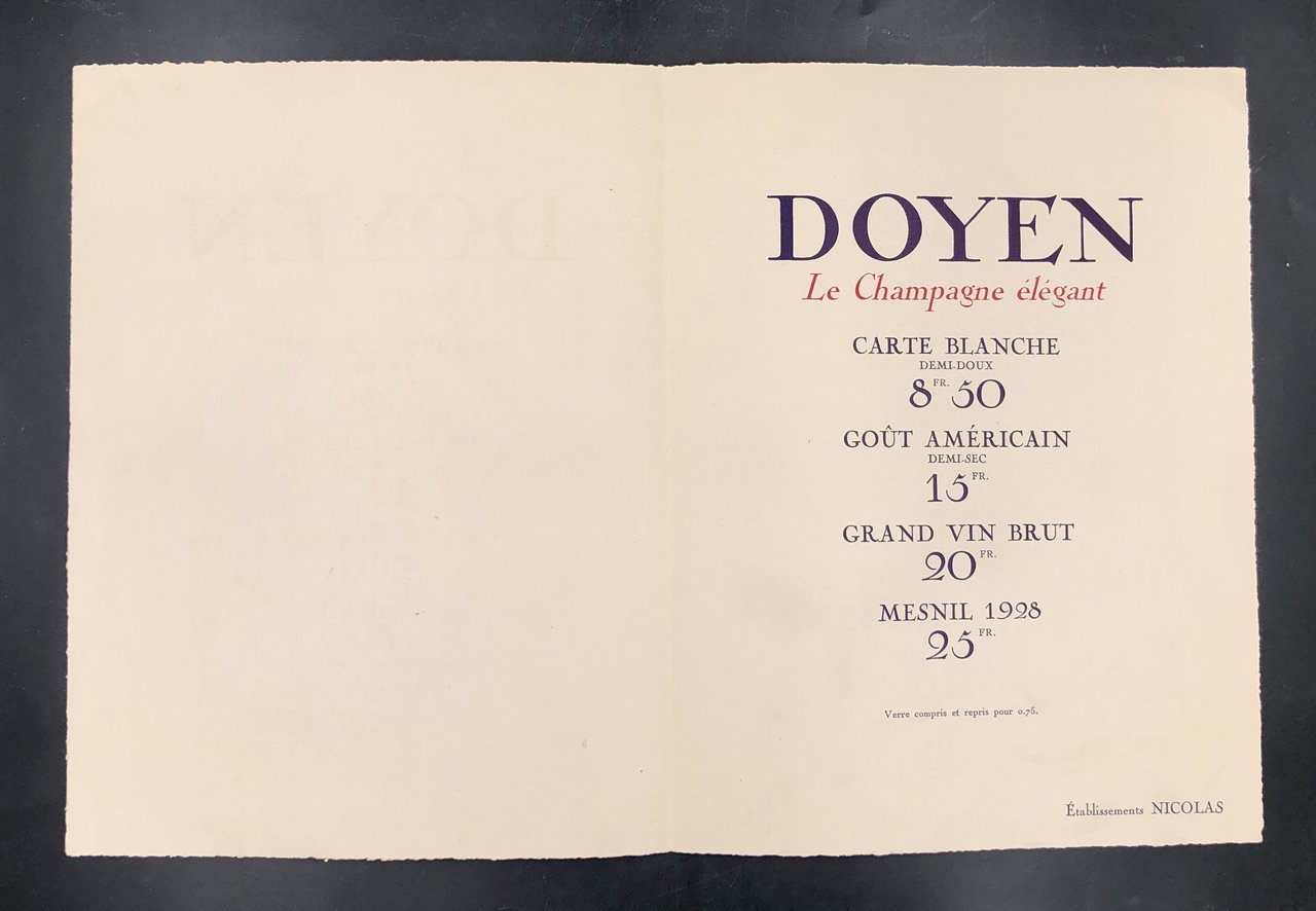 VIGNETO. Cataloghino di "Doyen Le Champagne élégant" Etablissment NICOLAS.