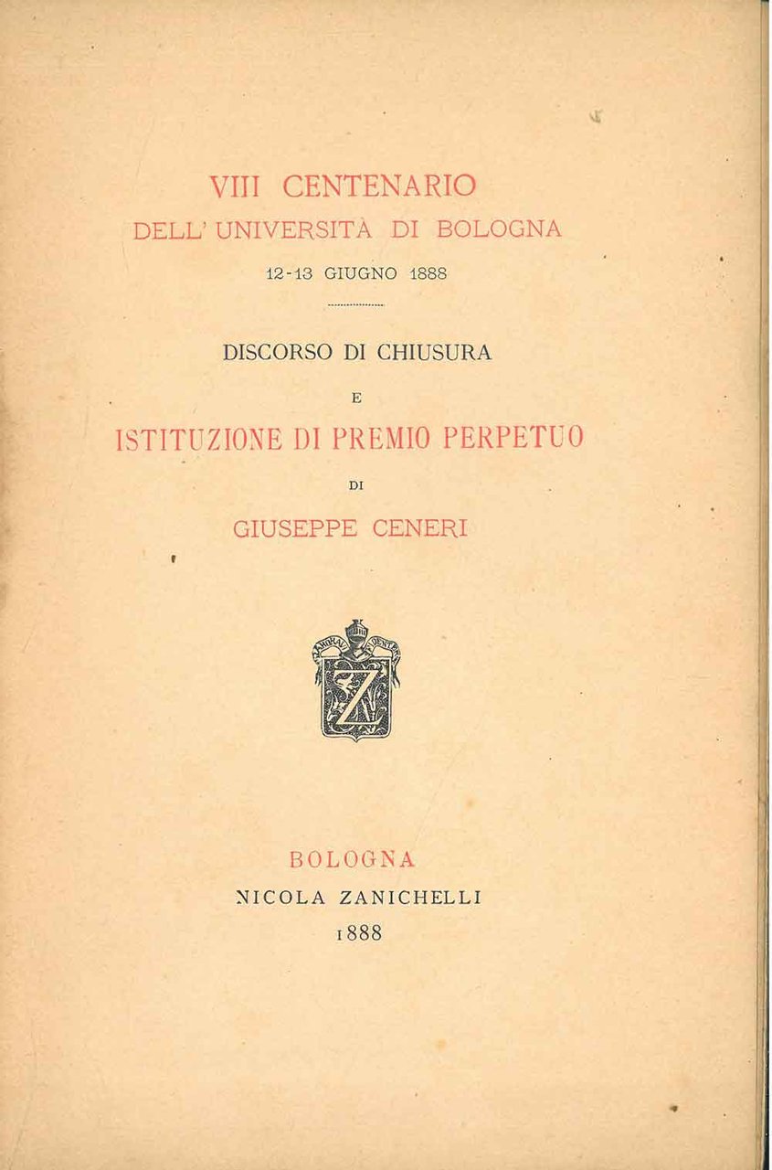 VIII centenario dell'Università di Bologna. Discorso di chiusura e istituzione di premio perpetuo