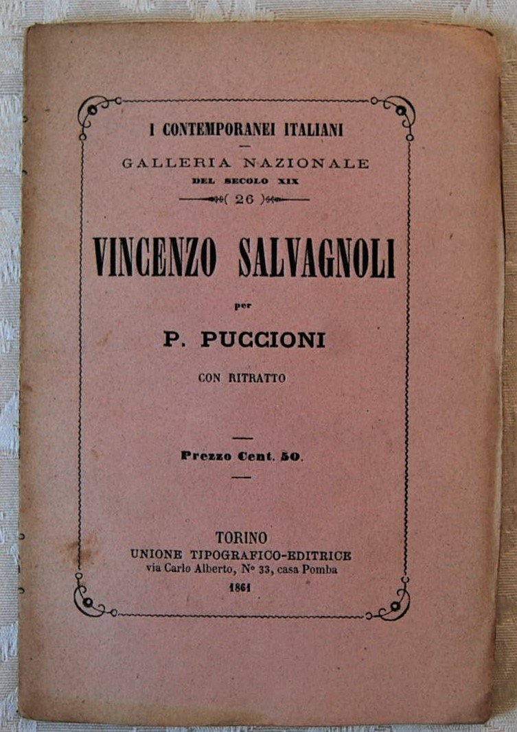 Unione Tipografica Editrice, 1861. In-16, brossura, pp. 58, una tavola con ritratto del Salvagnoli all'antiporta. Collana: Contemporanei italiani numero 26. Timbro di appartenenza di biblioteca privata. Lievi fioriture, peraltro in buono stato.