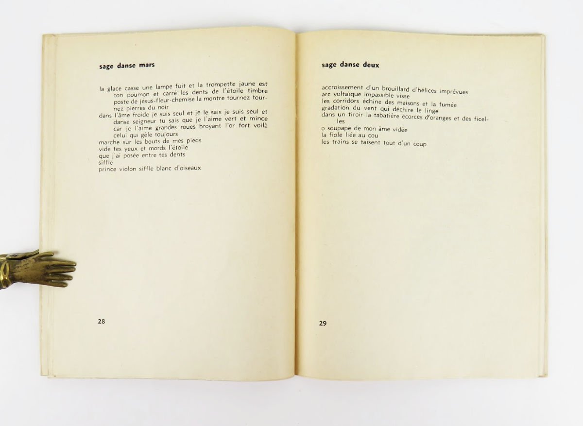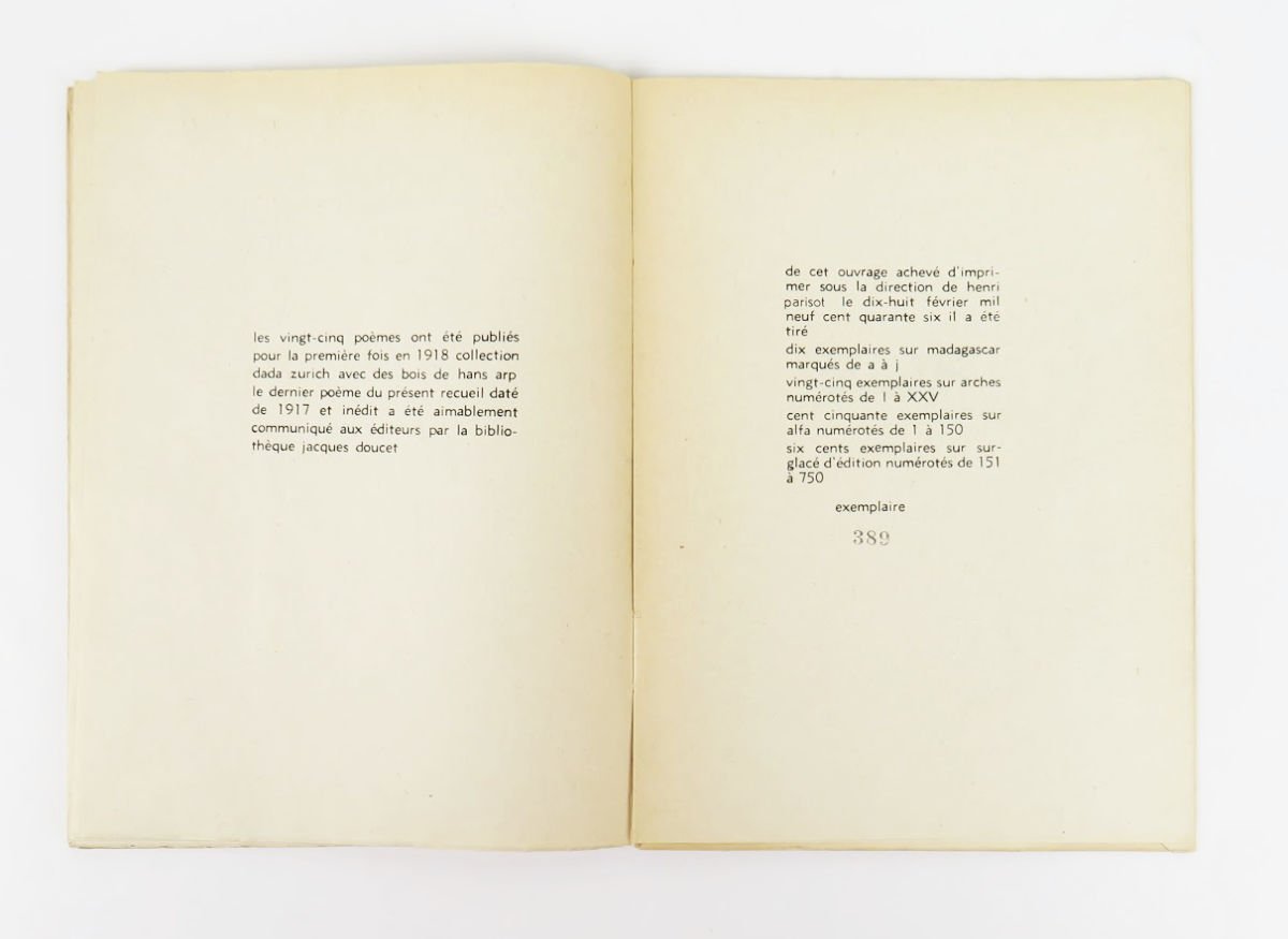 LIBROSeconda edizione aumentata.Esemplare 389/750, in ottime condizioni (piccole mancanze alla testa e al piede del dorso). Non facile a trovarsi così.Straordinaria raccolta di poesie d’avanguardia, con diversi spunti di paroliberismo dada, ornata dalle splendide incisioni di Harp a piena pagina. Seconda edizione aumentata, che segue la prima pubblicata nel 1918 a Zurigo nella collezione «Dada».