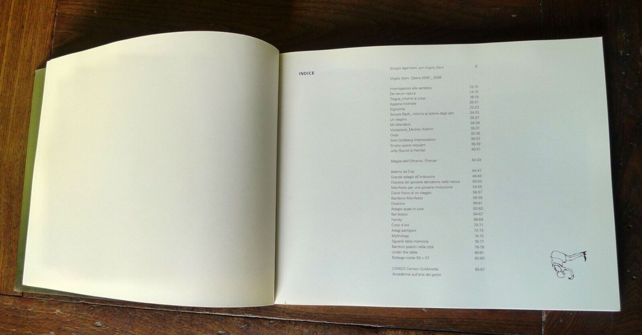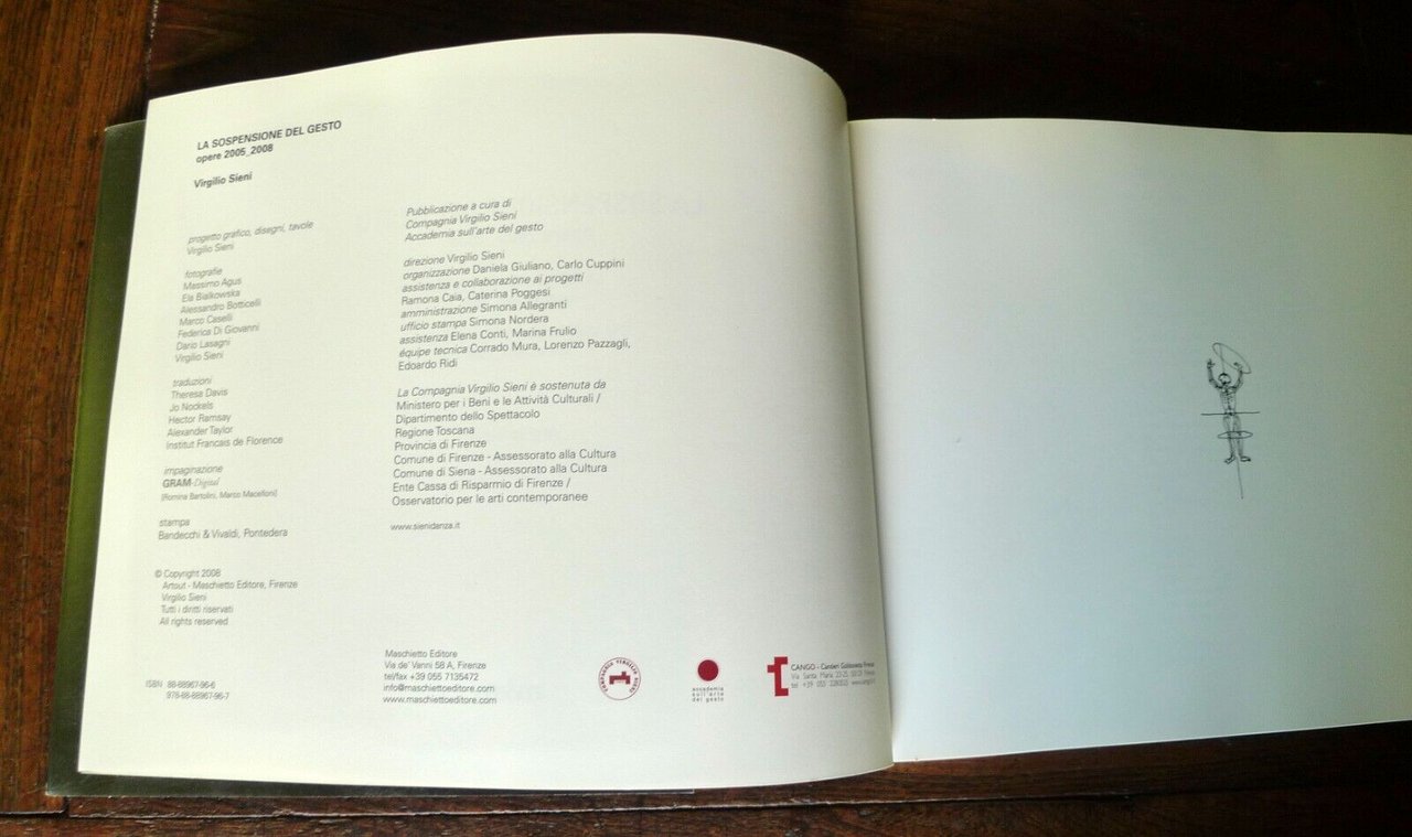 Virgilio Sieni,LA SOSPENSIONE DEL GESTO.Opere 2005_2008.LA SUSPENSION DU GESTE.Oeuvres 2005_2008.THE SUSPENSION OF THE GESTURE.Works 2005_2008.Artout - Maschietto Editore, Firenze 2008,brossura, 26x21 cm., pp.86,illustrazioni in nero e a colori,testo in italiano, francese, inglese,COLLANA IL GESTO,ISBN: 88-88967-96-6,peso: g.300