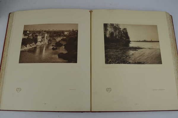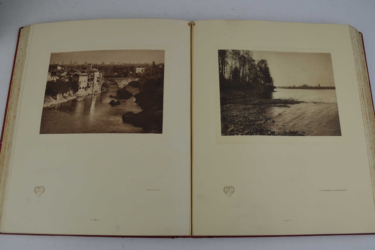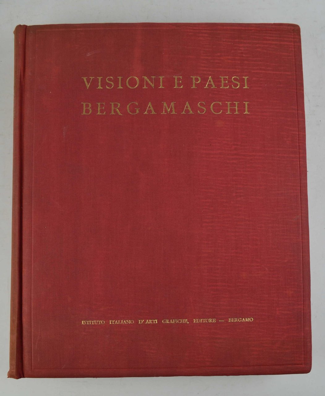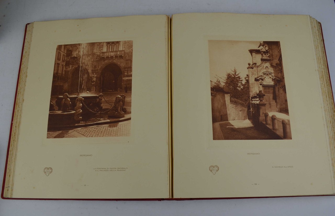 Cm. 32, pp. (22) + 100 tavole con fotoincisioni. Legatura editoriale in piena tela rossa con titoli in oro a piatto e dorso. Pochi segni d'uso, peraltro esemplare ben conservato. Elegante e ricercata pubblicazione stampata su carta forte in soli 350 esemplari. Le fotografie di Cesare Villa raffigurano vedute e scorci di Bergamo e delle sue valli (S. Martino, Brembana, Seriana, Cavallina).