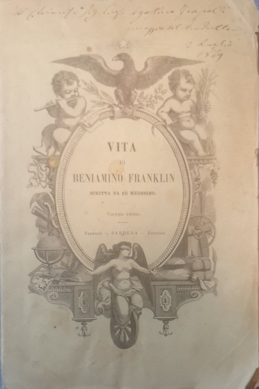 In-16 gr., brossura editoriale illustrata (presente una dedica a penna datata 1869), pp. XV, 300, presente un ritratto in incisione di Benjamin Franklin, buon esemplare.<br>