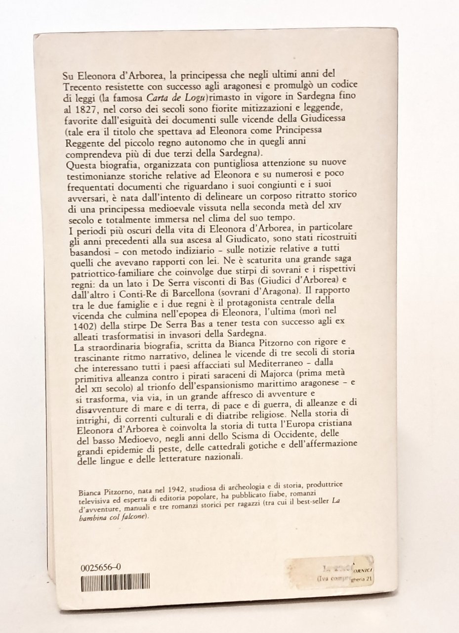 PRIMA EDIZIONE, collana Storia & Storie. Di difficile reperibilità Vita di Eleonora d'Arborea, principessa medievale di Sardegna, è un romanzo biografico per adulti di Bianca Pitzorno sulla figura realmente esistita della giudicessa medievale sarda Eleonora d'Arborea, promulgatrice della Carta de Logu. Il testo è frutto di cinque anni di ricerche d'archivio, sebbene parte della vita della giudicessa (sulla quale esistono poche fonti documentarie) sia ricostruita con procedimento indiziario, basandosi cioè sugli indizi piuttosto che sulle prove. Il testo originale era stato commissionato all'autrice a metà degli anni settanta da Raffaele Crovi, funzionario RAI ed editore, su richiesta del quale Pitzorno aveva scritto il suo primo romanzo per ragazzi: Sette Robinson su un'isola matta. Il romanzo biografico, pubblicato nel 1984 dalla casa editrice Camunia, con copertina di Federico Maggioni, ottenne recensioni positive e apprezzamenti in ambito accademico, ma scarso successo di pubblico. In brossura. Pp. 375. Buone condizioni.