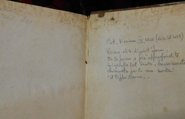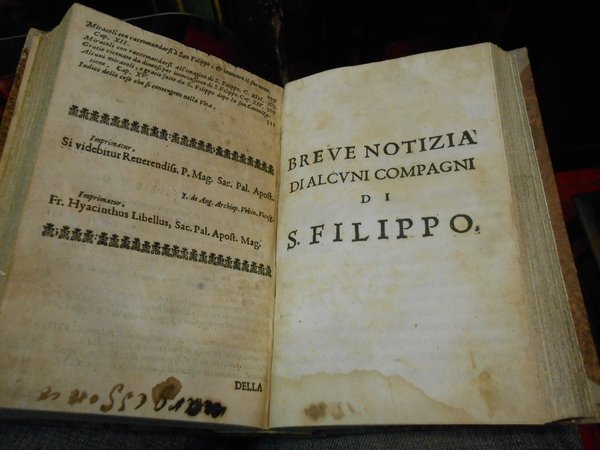 RILEGATO NELL'800 IN MEZZA PELLE MARRONE CON TITOLI AL DORSO IN ORO, MARGINI RIFILATI. INTERESSANTE L'AGGIUNTA "BREVE NOTIZIA DI ALCUNI COMPAGNI DI S. FILIPPO" numero pagine: 530 + INDICE + 272 formato: 19X12.7 stato conservazione: DISCRETO, NUMEROSE FIORITURE, ALCUNI ALONI E GORE. AD UNA PAGINA AL CENTRO SCRITTA A PENNA