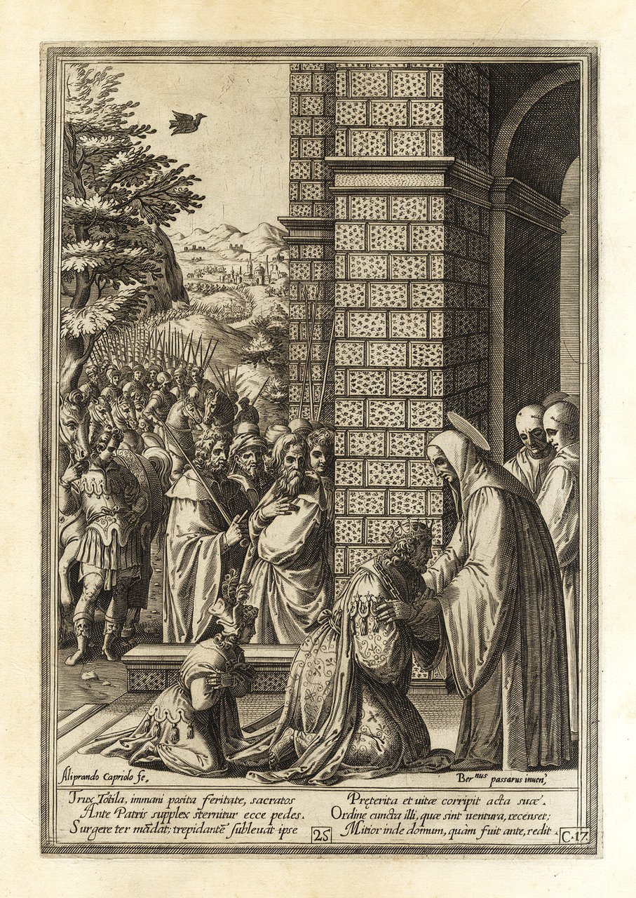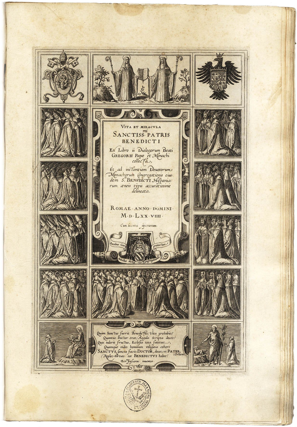 >in-folio (400x280mm), titolo figurato e 49 tavole, numerati da 1 a 50, incisioni in rame all'acquaforte a piena pagina. Bernardino Passeri (1540-1590) e Aliprando Caprioli (1540 c. - 1590 c.) furono gli artisti che disegnarono e incisero questa straordinaria serie di episodi della vita di S. Benedetto. Il titolo è racchiuso da bordura formata da 15 vignette inerenti al Santo. Legatura coeva o di poco posteriore in piena pergamena con filettature concentriche in oro e fregi agli angoli. Al centro degli stessi sono dipinte delle armi araldiche (non ancora identificate) racchiuse in ovale in oro e contornate da una banda condivisa ''In lumine Tuo videbimus lumen'' (tratto dai Salmi, 35:10; in epoca più recente divenne il Motto della Columbia University). La serie costituisce un capolavoro dell'incisione del secondo cinquecento italiano ed è estemamente rara. Esemplare magnifico, con ampi margini, completo e perfettamente conservato in bella legatura del tempo. Cfr. Mortimer, Harvard Italian Books, n. 362. Thieme-Becker, V, 556 e XXVI, 283.