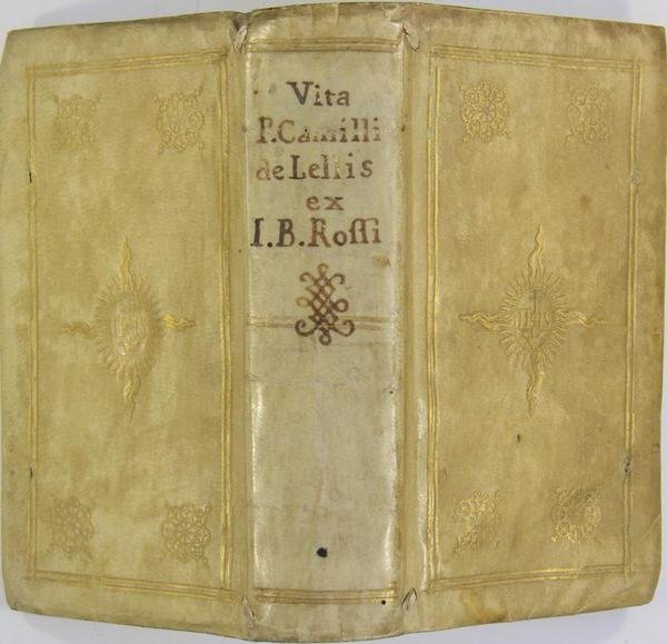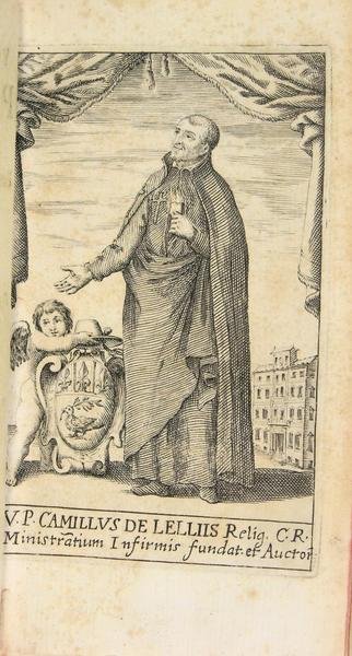 Haeredum Corbelletti, Romae, 1651. In-12 (16 x 9 cm) reliure postérieure en plein velin, titre manuscrit sur le dos, décor doré sur les plats, tranches rouges, 2 f., frontispice, 4 f., 576 p. Quelques menus défauts : 1 page doublée (intercalée à la fin de l'ouvrage), 2 feuillets d'index intervertis. Saint Camille de Lellis (1550 - 1614) eut une jeunesse frivole et mouvementée. Après un incurable ulcère à la jambe qui lui fit rencontrer la foi, il fut infirmier à Rome. Il est le fondateur de l'ordre des Camilliens (clercs réguliers des Infirmes) et, à ce titre, est le protecteur avec Saint Jean de Dieu des hôpitaux et des malades.