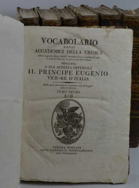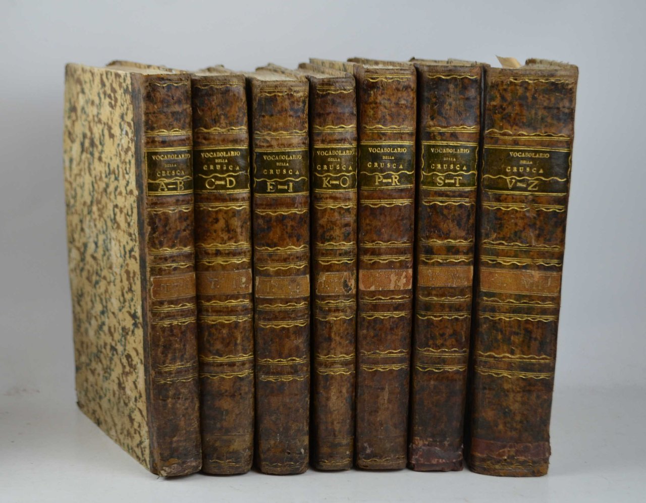 Sette volumi di cm. 27,5, pp. 3.000 ca. complessive. Marchio tipografico in xilografia a ciascun frontespizio. Legatura coeva in mezza pelle, dorsi lisci con titoli in oro su triplice tassello tricolore. Testo su tre colonne. Esemplare genuino e marginoso, ben conservato. In fine al settimo ed ultimo volume sono presenti le seguenti appendici e testi: Autori o libri d'autore del buon secolo. Libri di certo autore. S.n.t., pp. 72. Unito a: Indice delle voci, e locuzioni latine. Pp. 237 (di 243 in quanto privo delle pp. 147-152). Unito a: BALDINUCCI F. Vocabolario toscano dell'arte del disegno. Verona, Ramazzini, 1806. Pp. viii, 85 (1). Unito a: PASTA ANDREA. Voci e maniere di dire e osservazioni di toscani scrittori e per la maggior parte del Redi. Verona, Ramazzini, 1806. Pp. ix (1) 165 (1). Il primo volume contiene inoltre due ulteriori aggiunte: "Sopraggiunta di voci e modo di dire" e "Autori o libri d'autori del buon secolo. Libri di carto autore".