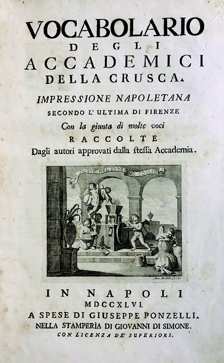 (Crusca-Ediz.‘700) VOCABOLARIO DEGLI ACCADEMICI DELLA CRUSCA. Impressione napolitana secondo l’ultima di Firenze. Con la giunta di molte voci raccolte dagli Autori approvati dalla stessa Accademia. In Napoli, a spese di G. Ponzelli nella stamperia di G. Di Simone. 1746-1748. 6 volumi in folio (41x27), buona legatura coeva m. pelle chiara, dorso a scomparti con tit. ed eleganti fregi dorati; oltre 3000 pagine complessive. Vignette ai frontespizi. Testo su due colonne.