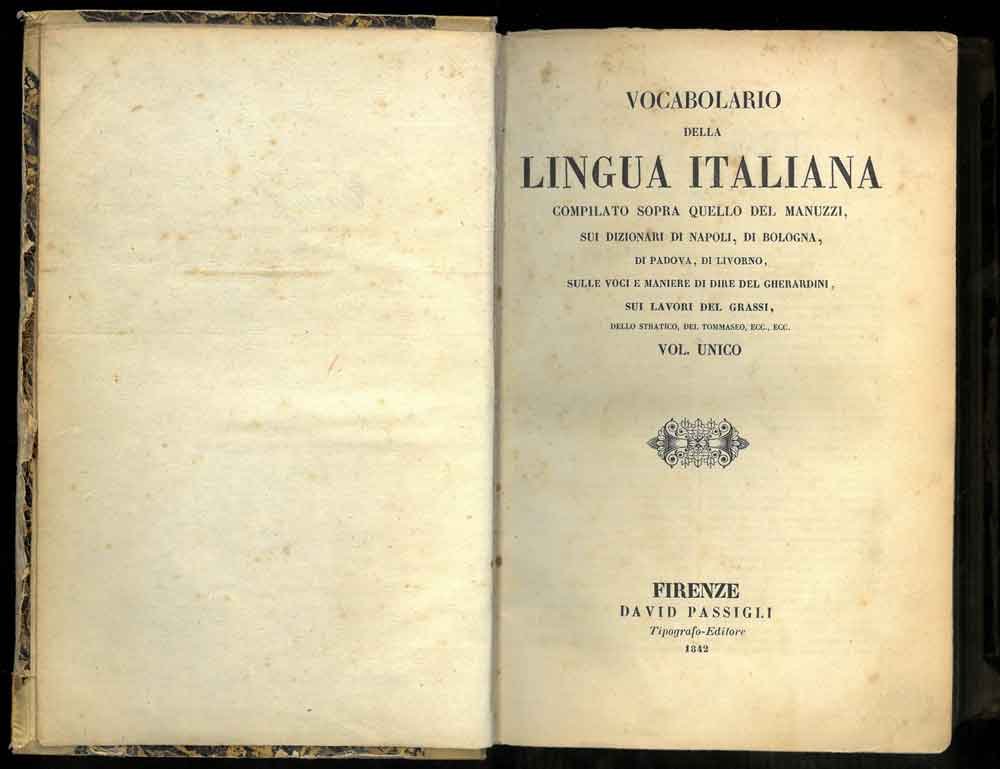 Vocabolario della Lingua italiana compilato sopra quello del Manuzzi, sui dizionari di Napoli, di Bologna, di Padova, di Livorno, sulle voci e maniere di dire del Gherardini, sui lavori del Grassi, dello Stratico, del Tommaseo, ecc.ecc. Volume unico.